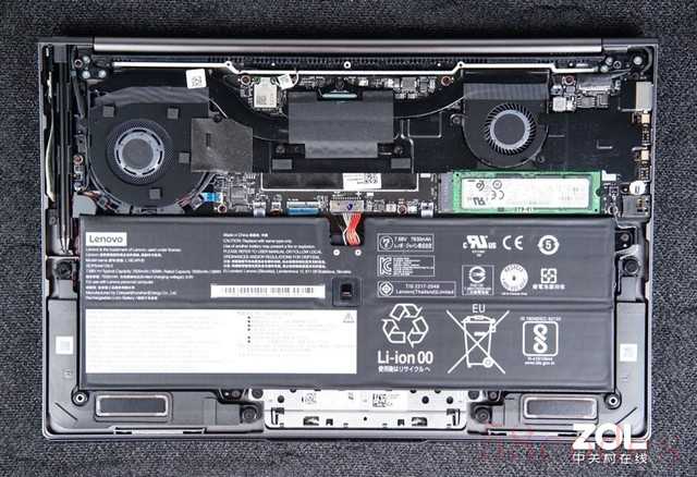 YOGA C940的内部空间利用率非常高,没有任何的空间富裕,同时整体熏黑的内部色调就散发出高端的味道。同时,内部的各项防护措施和细节也都代表着YOGA系列的顶级水平。另外,我们还在C940的内部发现了给力的双风扇双铜管散热模组,容量达到60瓦时的高密度电池,以及另外两个体积巨大的扬声器,这些都是它的加分项。