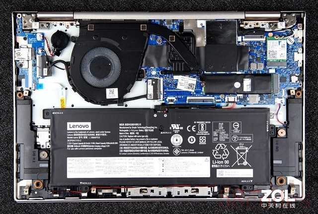 而C740的内部就没有那么惊艳了,散热风扇周围存在非常大的空间空余,内部空间利用率较低,电池容量为51瓦时,这可能和没有采用高密度材料有关。不过该机也配置了大体积的扬声器单元,其他的内部走线和各种绝缘防护和静电保护也十分到位,同样彰显了YOGA系列的卓越品质。