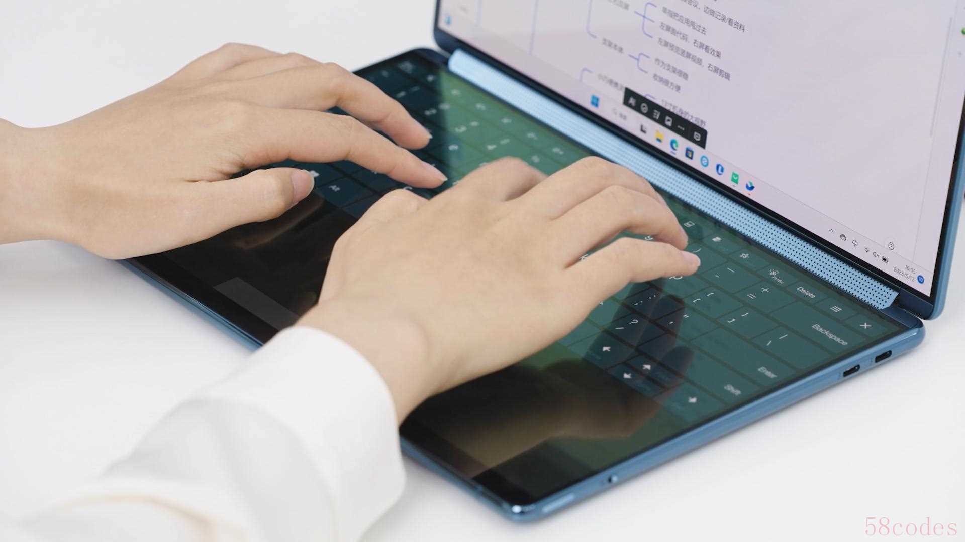 它的外观,是一眼可见的革新。这是全球首台拥有两块全尺寸(13.3英寸)OLED屏的笔记本,这意味着它能带来全新的笔记本使用方式。可以通过八指敲击,调出幽灵键盘进行输入。键盘可以提供一定的震动反馈,除了常用的快捷键之外,透明度、震动强度、声音反馈都可以自由调节。