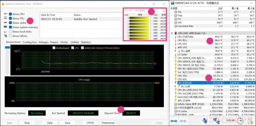 ▲Aida 64默认勾选四项,处理器考机30分钟,R7 6800H的封装功率始终维持在68W~70W,频率为全核4.36GHz。处理器内部核心温度89℃左右(这对满负载的移动高性能处理器来说算是较低温度)。由于采用12cm大风扇散热,所以风扇转速不高,整机非常安静。此时整机电表功率130W,而适配器为170W款,冗余度很高。