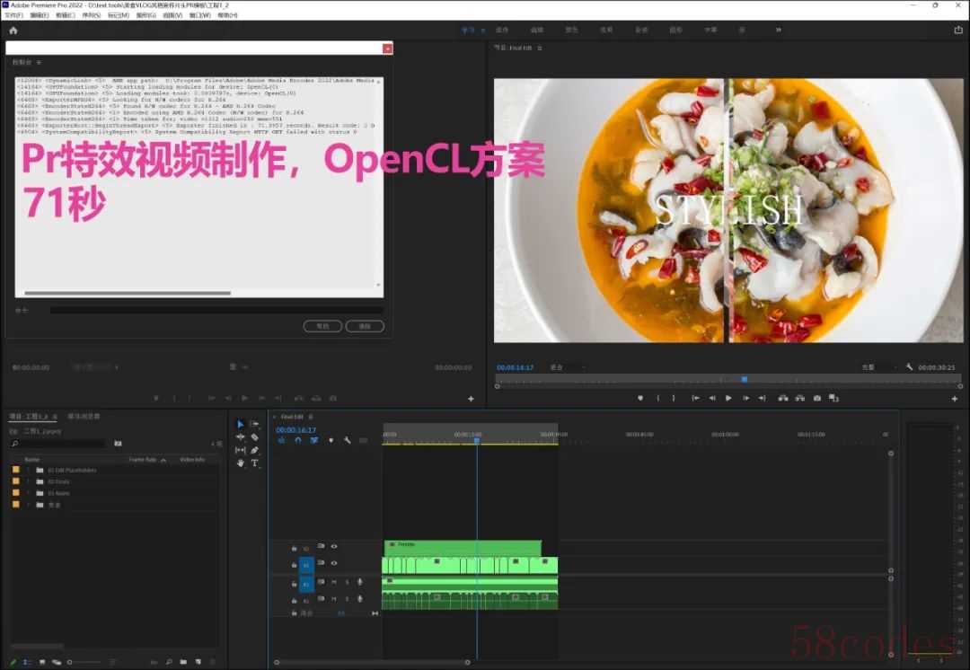 ▲Premiere Pro特效视频制作,用一堆超清美食图片来生成一个美食宣传视频。这个负载比之前的剪辑大得多,如果采用CPU方案,要182秒,而采用OpenCL方案,显卡参与加速,只要71秒。而R7 5800H款YOGA 27耗时要130秒。2022款少耗时45%,效率也提升近一倍!