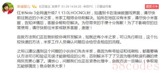 而就在今日,小米曝出了红米Note3更新变砖事件。大量红米Note3用户在不知情的情况下,由系统静默完成更新,而用户发现之后,手机已经出现BUG或者变砖。而目前为止,小米官方未对此事做出正式声明。仅有小米论坛版主发表帖子回应称,红米Note 3全网通升级7.1.13.0LHOCNCL版本时,如果遇到卡在连接数据线界面,请(用户)前往就近的小米之家寻找工程师解决,附近没有小米之家的用户可以联系客服解决问题。