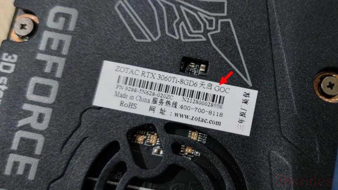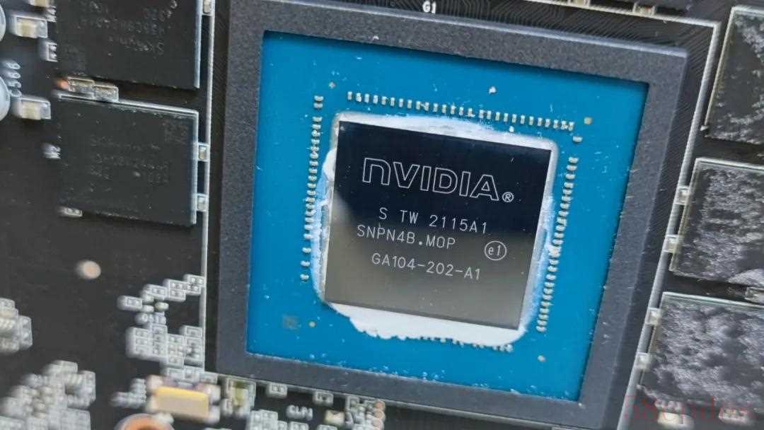 除了以上方法外,查看RTX 3060Ti LHR芯片还有一个终极版办法——打开显卡散热器直接看芯片上的激光雕刻型号,芯片上会清楚呈现GA104-202具体编号,而且这个编号是NVIDIA芯片出厂时雕刻上去的,除了NVIDIA之外,没有任何人可以修改这个编号。