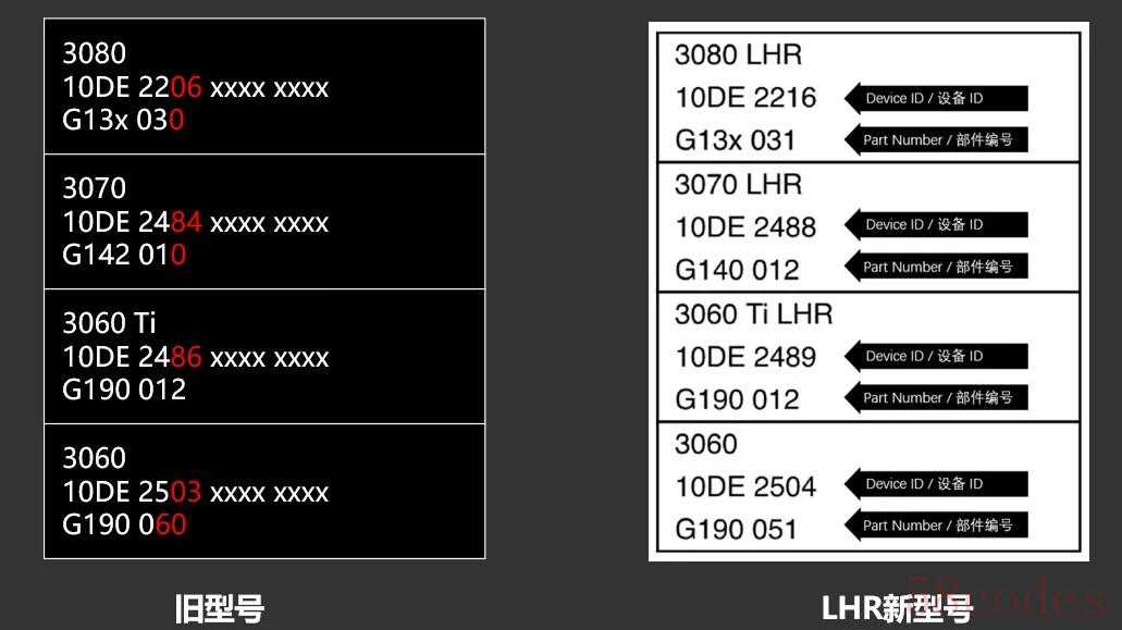以上就是NVIDIA每一款LHR芯片的设备ID,注意当前一共有四大系列芯片被NVIDIA更新了ID,分别为:RTX 3080/RTX 3070/RTX 3060Ti/RTX 3060,设备ID的最后两位都被更新了。