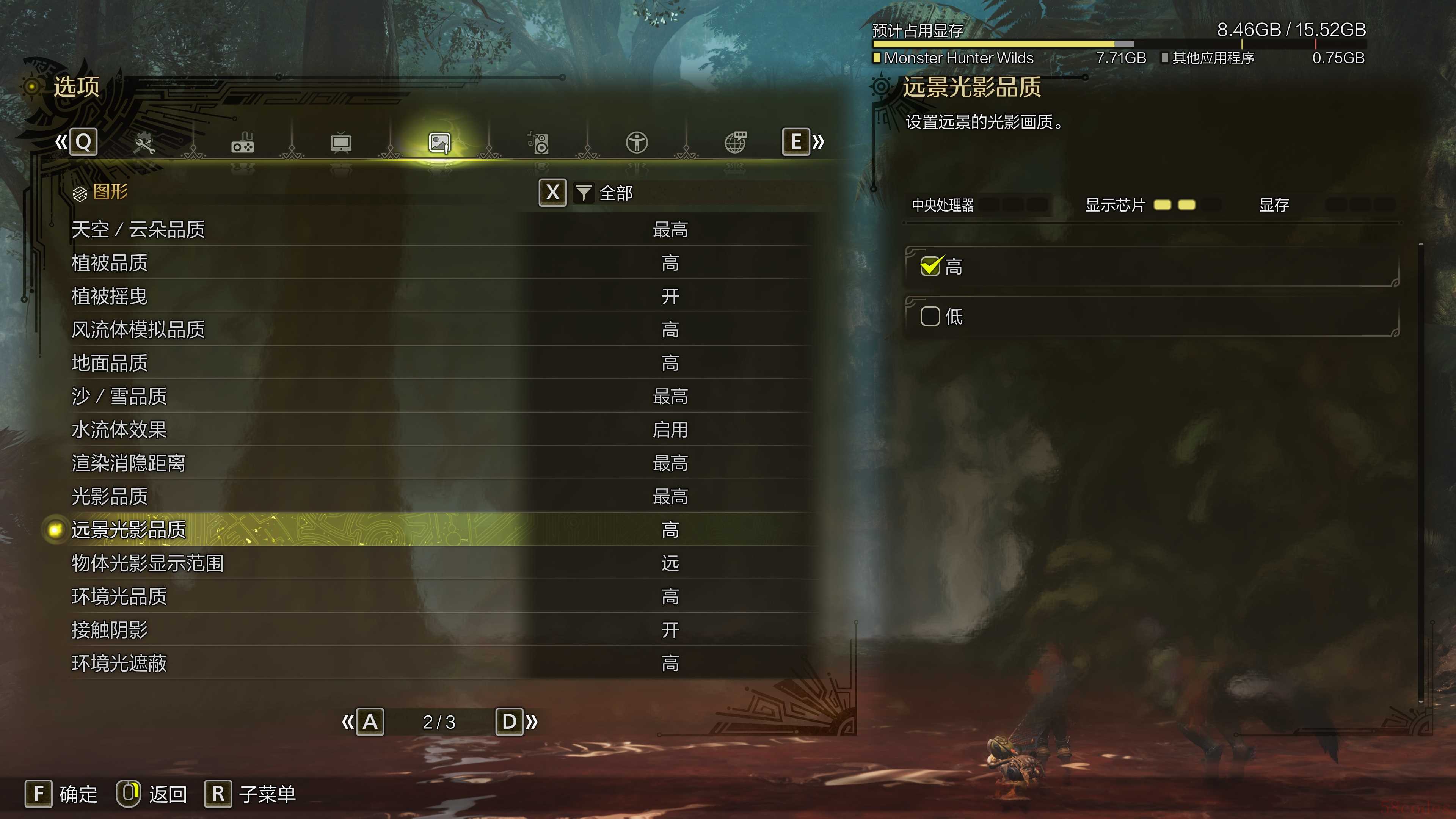 《怪物猎人:荒野》UI界面还是熟悉的怪猎味道,交互逻辑以人性化为核心,不仅详细罗列了选项特效说明和对中央处理器/显示芯片/显存的性能影响,而且在右侧区域可以展现不同设置下的画面差异,而右上方还有一个预计占用显存的条形UI,以上这些都可以辅助玩家精准调节画质。