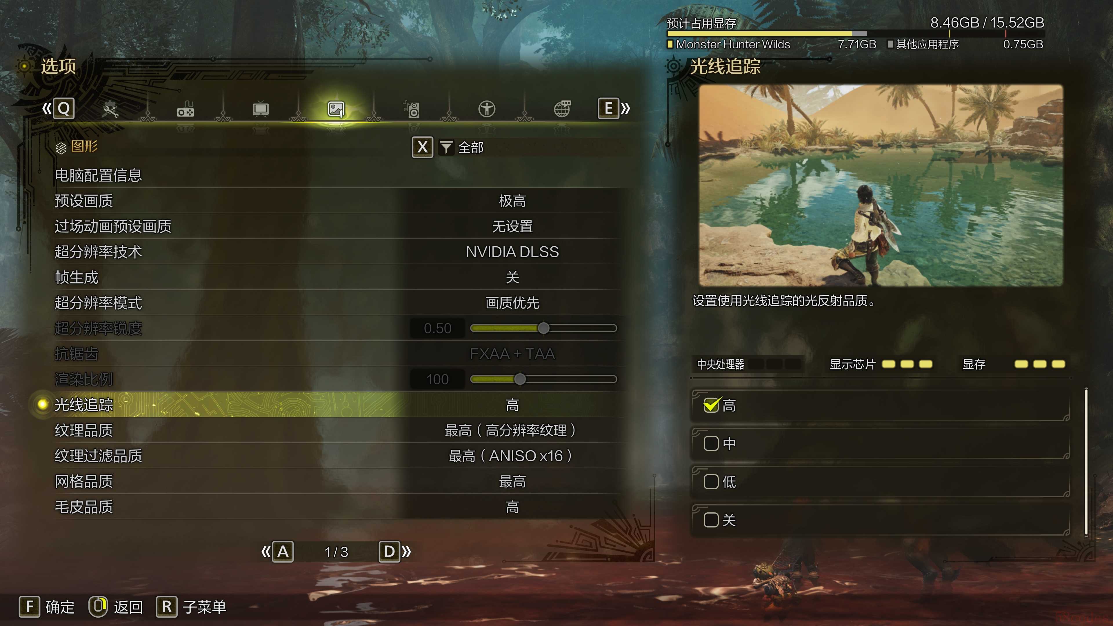 《怪物猎人:荒野》和画质相关的自定义选项远超20个,其中有不少都是依据开放世界设计,比如天空/云朵品质、水流体效果、植被摇拽、渲染消隐距离等,还包含高、中和低三档光线追踪技术,不过光追只作用于反射层面,相比如今光追集成度极高的大作就是小巫见大巫~