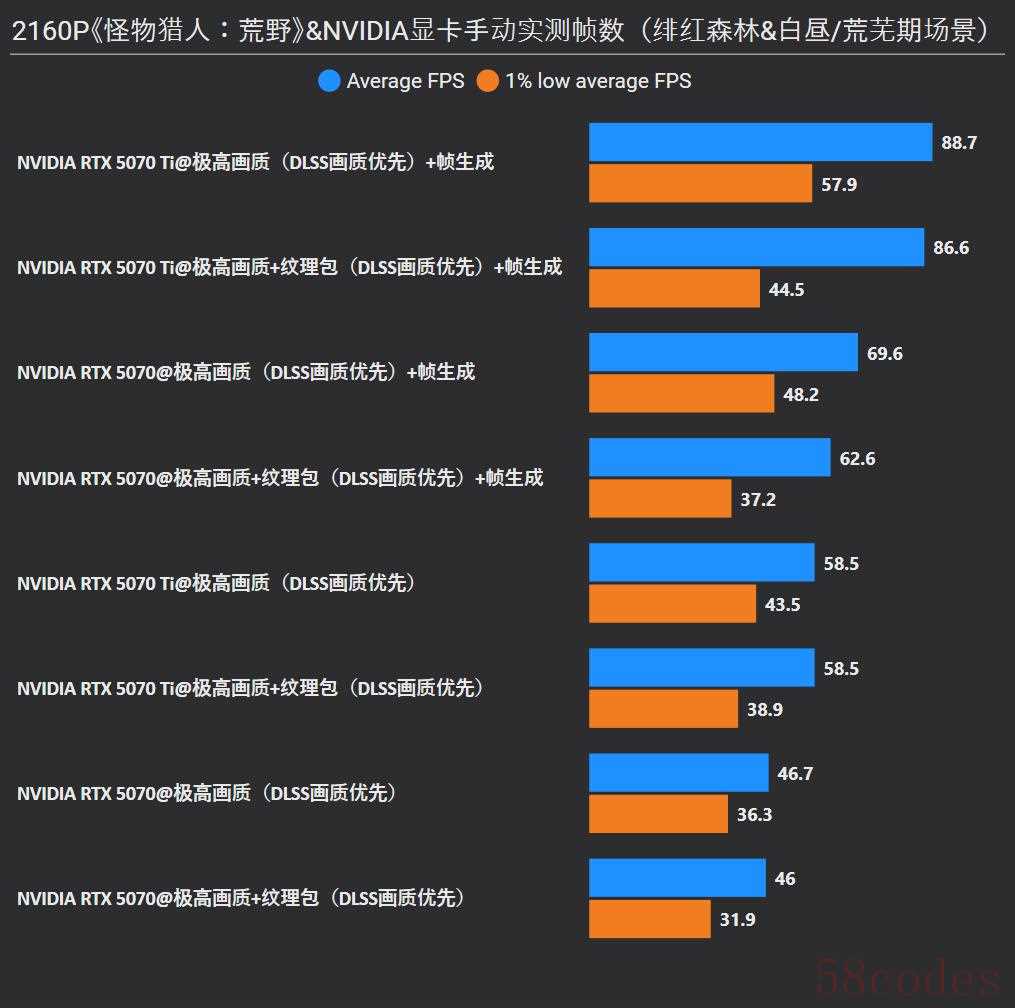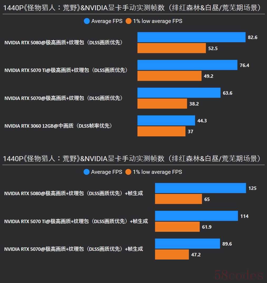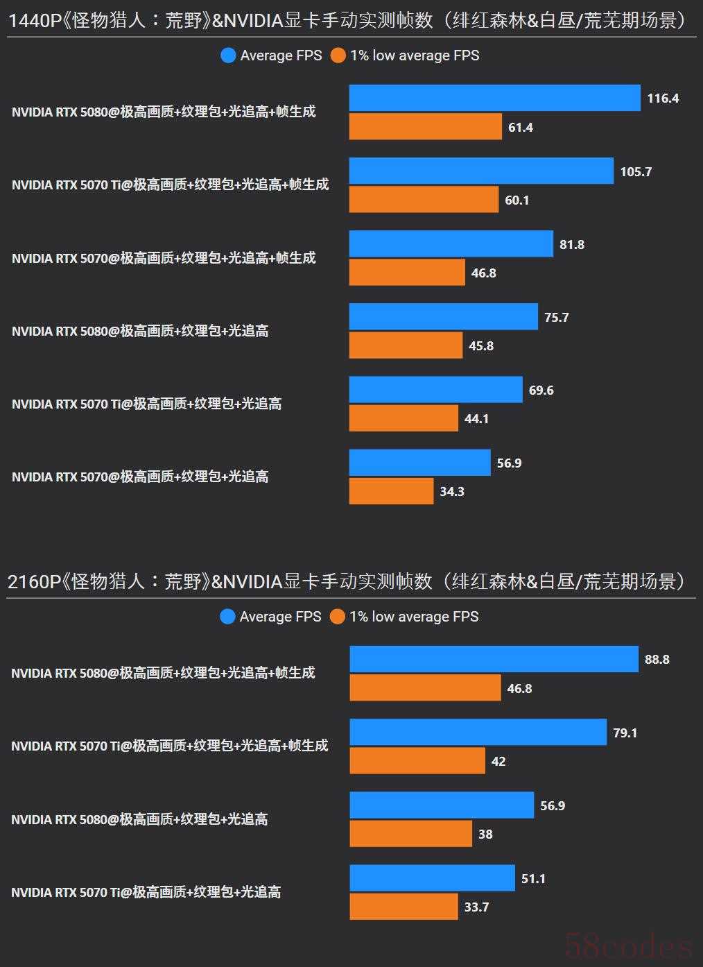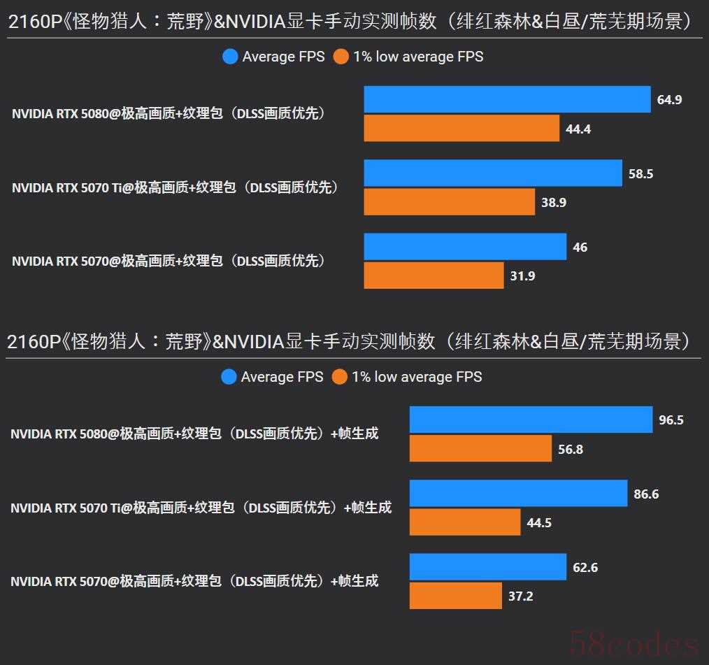 4K分辨率,RTX 5080和RTX 5070 Ti两者差距依旧不算特别大,唯独就是RTX 5080在极高画质下可以更接近60fps,再搭配帧生成两者帧数差异在实际游玩当中感知会更小,所以个人会更推荐RTX 5070 Ti即可满足高品质狩猎体验。