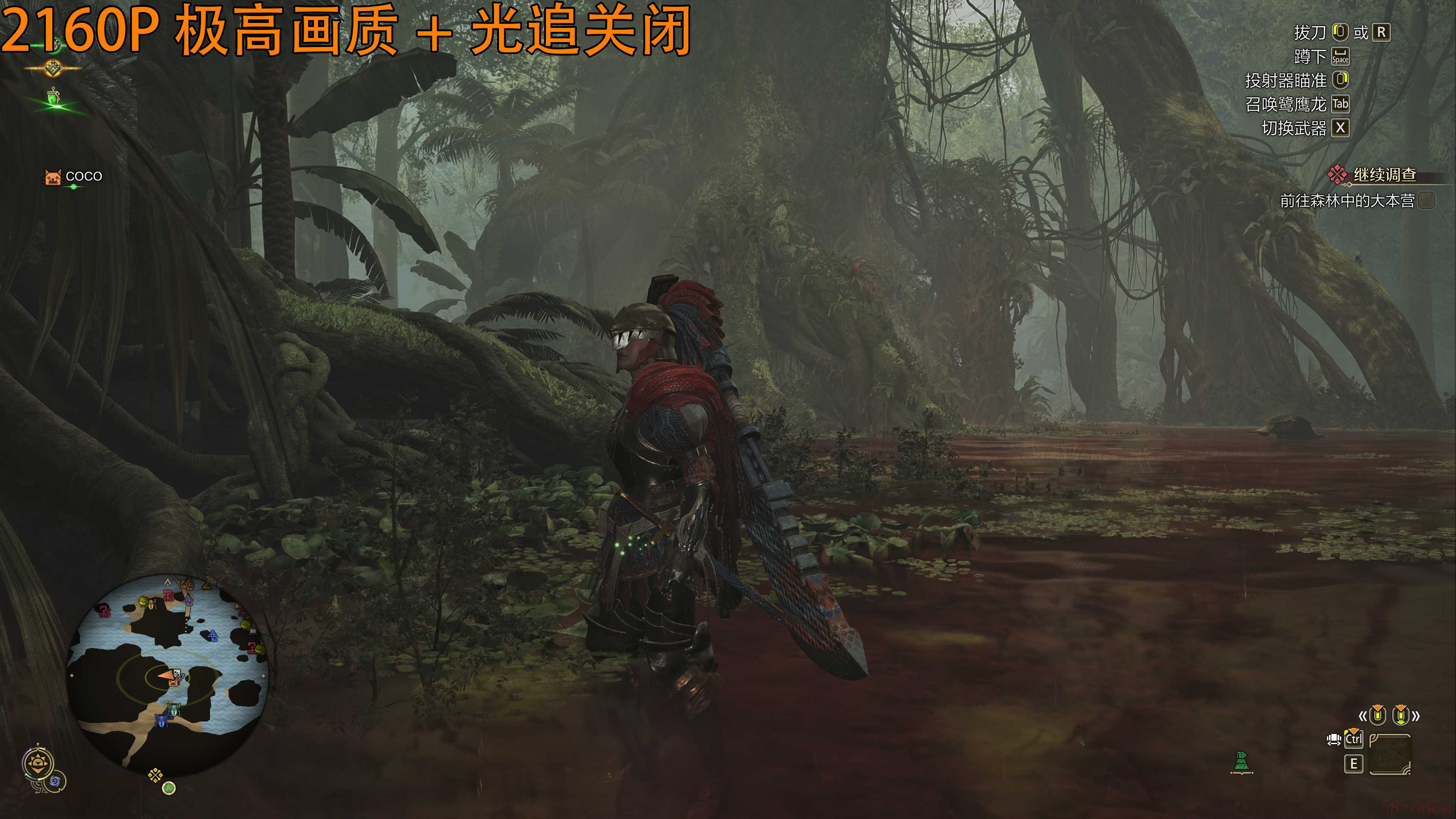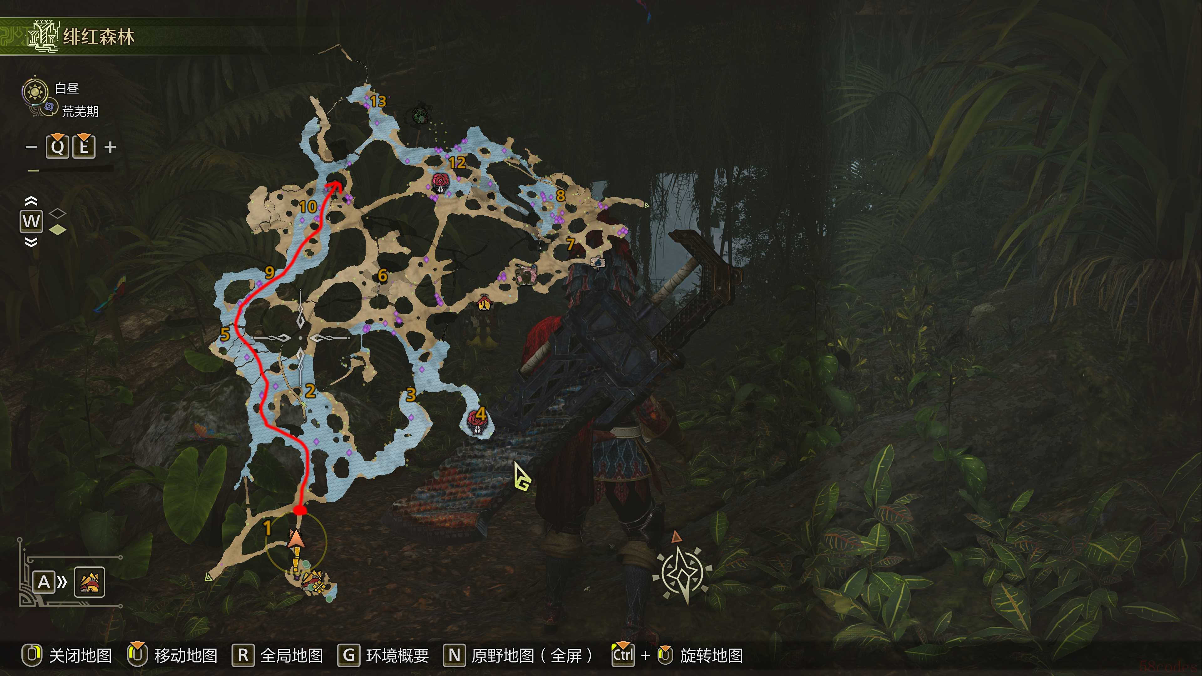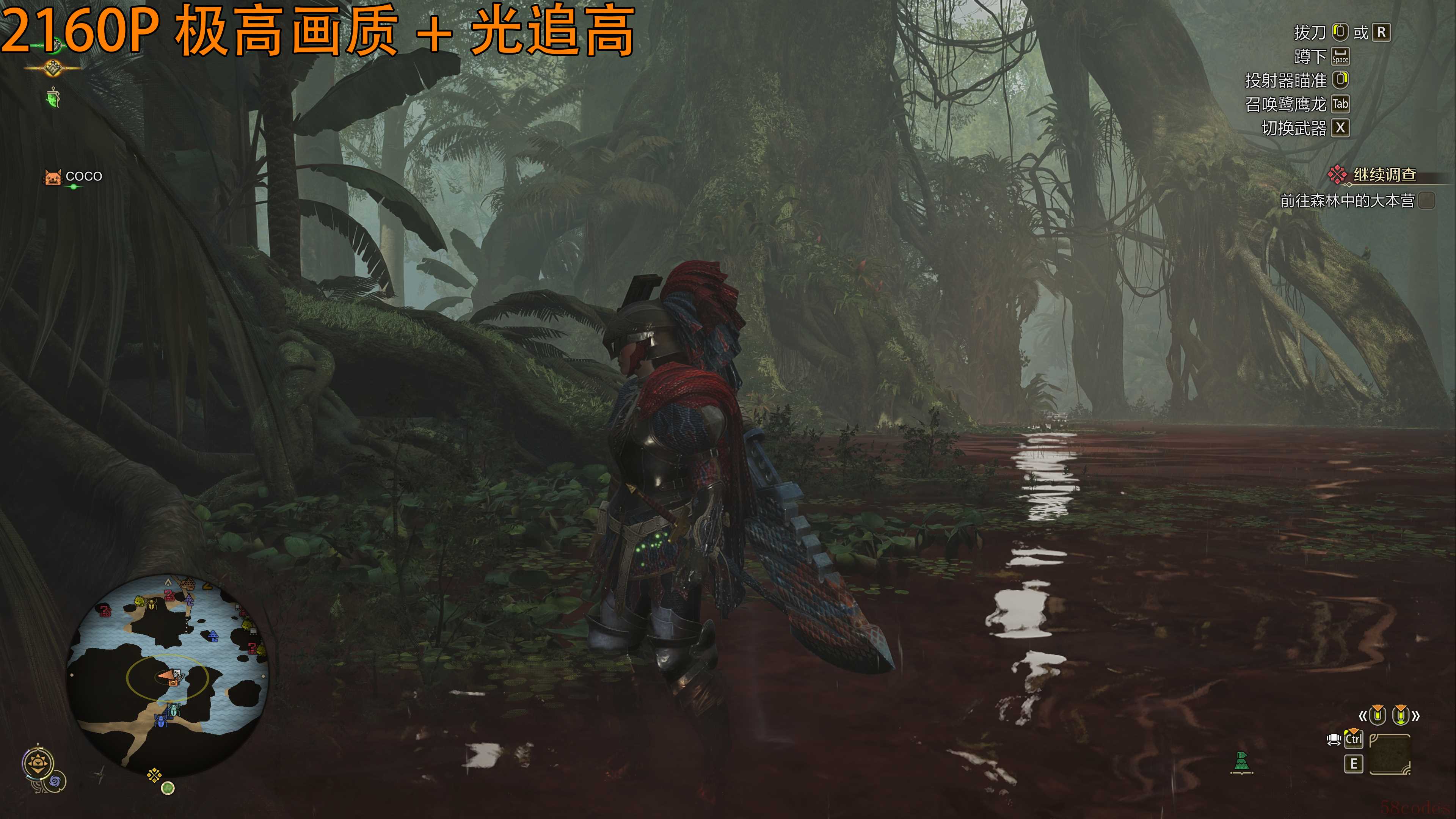 关于测试场景方面,这次挑选的场景是绯红森林,并固定是白昼和荒芜期,手动测试的路线上图红线标识所示,全程由于是骑鹭鹰龙自动导航,视角和路线是可保证每次100%准确的,该路线途径森林、水域以及少量怪物中高强度区域,加上有日光的存在也便于测试光追反射效果。