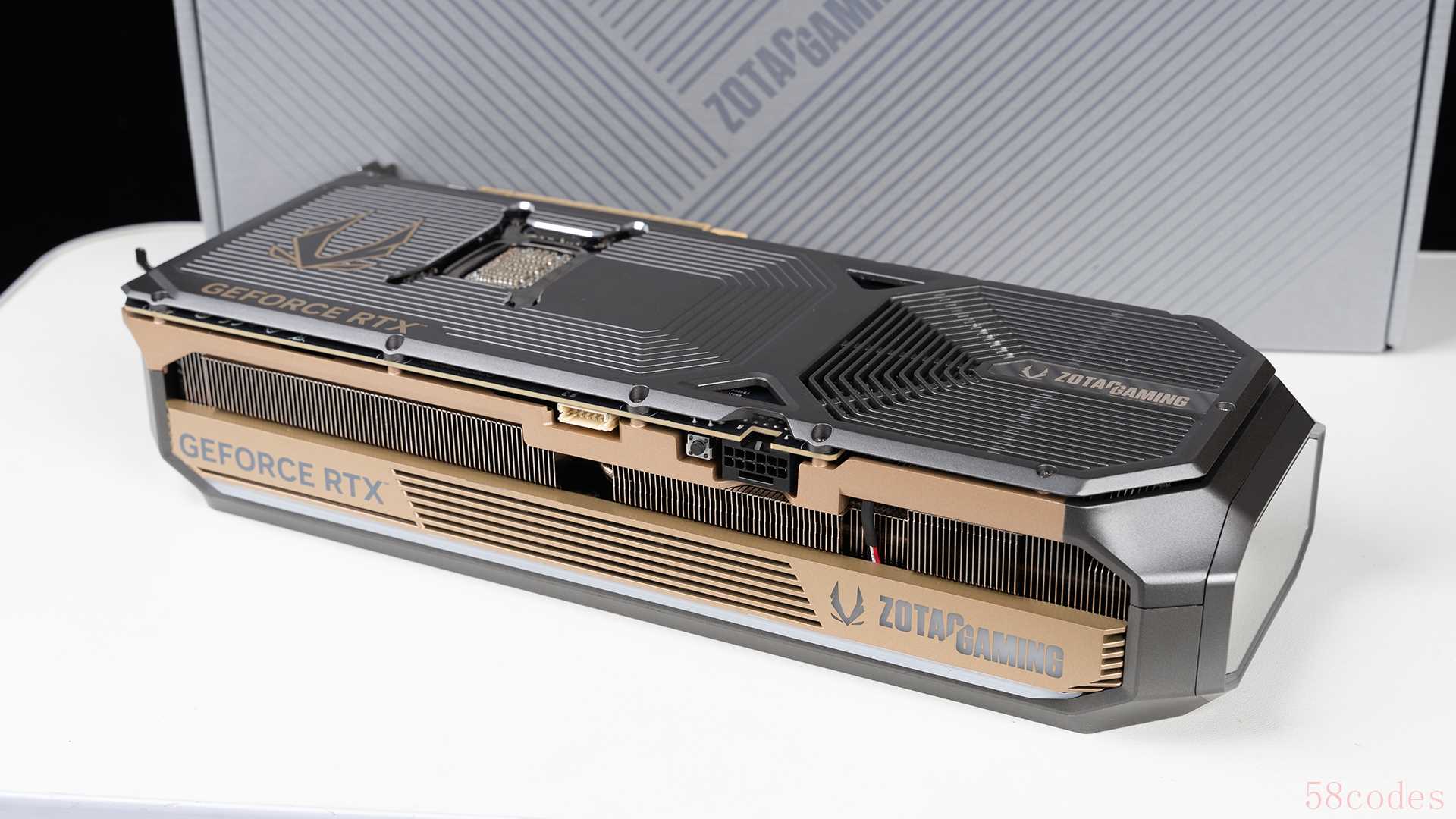 索泰RTX 5070 Ti AMP EXTREME INFINITY的金属背板条纹会更加丰富,古铜色部分就是其合金中框,值得一提的是本代AMP系列在显卡尾部加入了无限镜ARGB的设计,构建出一种超现实的艺术感。显卡同样搭载12V-2x6 16pin供电接口,旁边还有双BIOS按钮和幻光同步接口。