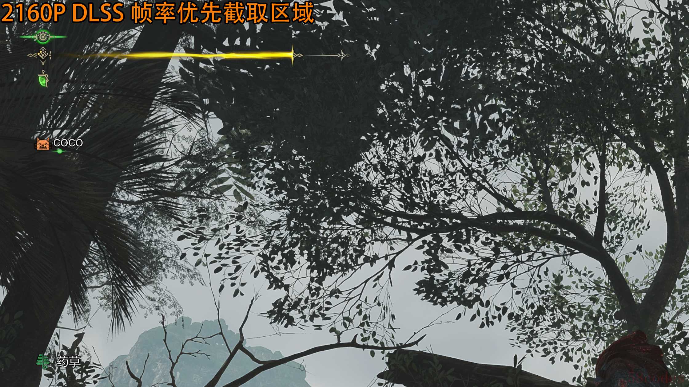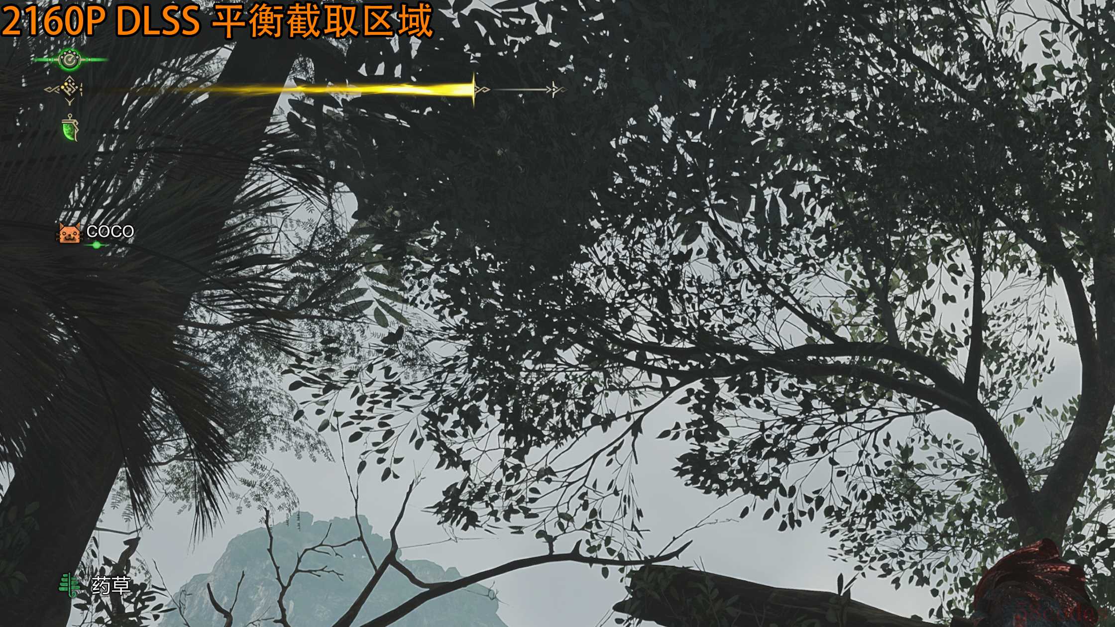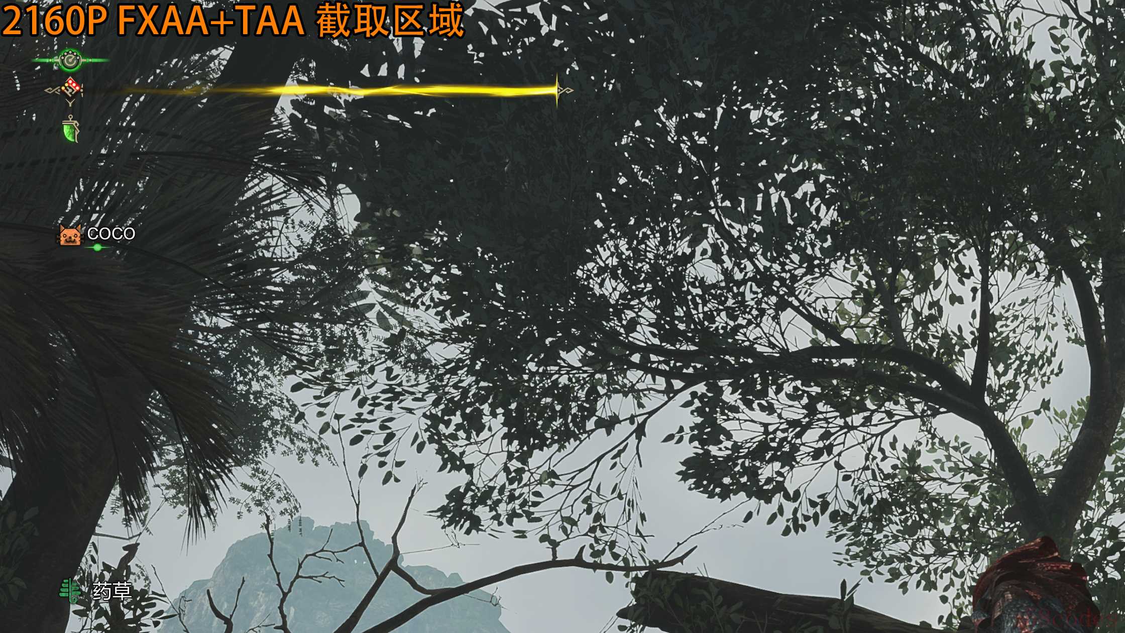 FXAA+TAA是《怪物猎人:荒野》内置的原生抗锯齿,硬核特意截取了更为考验抗锯齿和超分辨率技术的树叶和枝干物体区域。