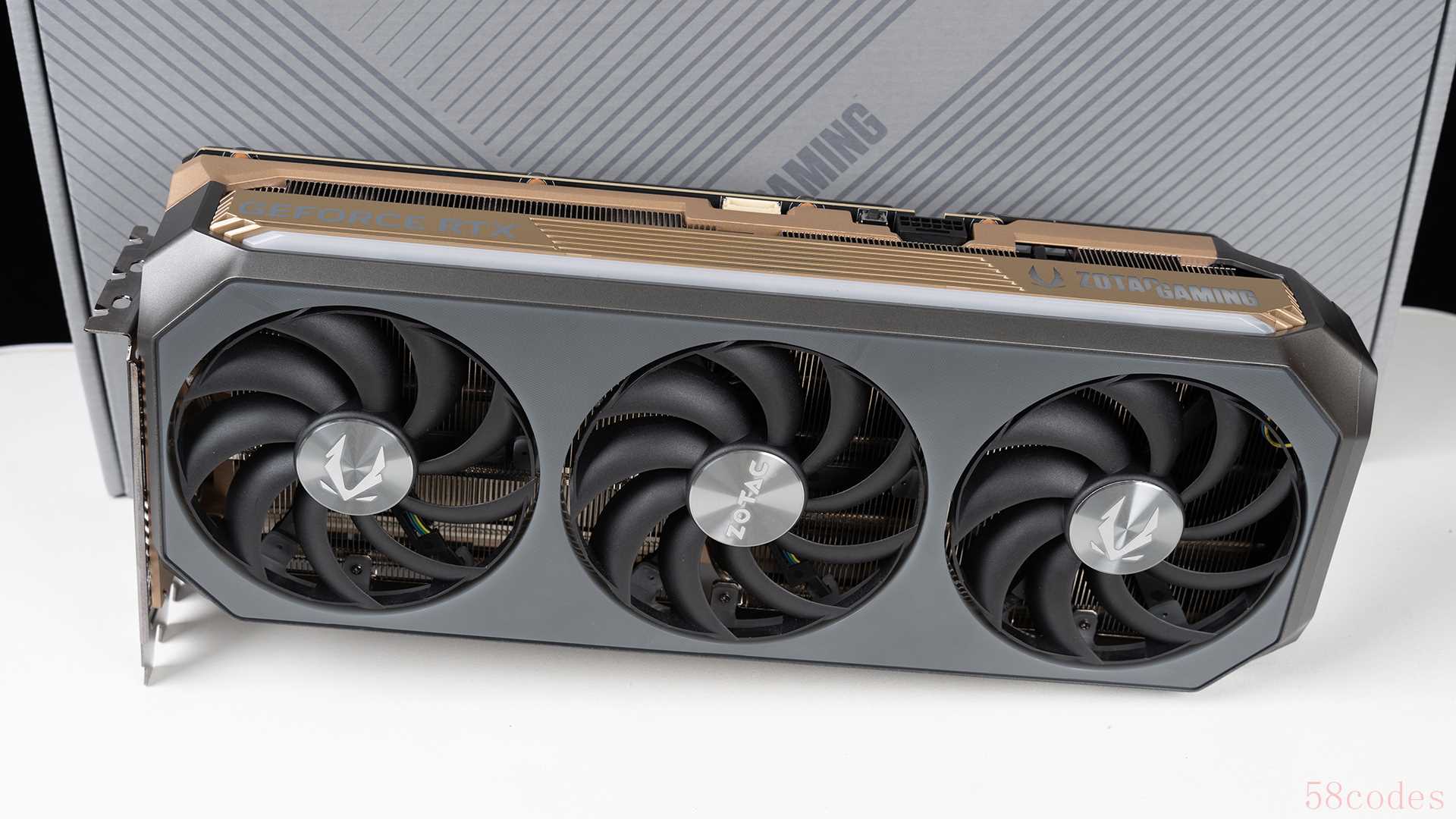 第二款也是来自索泰,定位全新高端的RTX 5070 Ti AMP EXTREME INFINITY,它更偏优雅风格——外观采用更为细腻的斜向纹路,再搭配水泥灰和古铜配色,肩部和尾部采用三区ARGB灯效。显卡亦同样搭载ICESTORM 3.0散热系统,包含三颗90mm环刃风扇、VC均热板+7根6mm镀镍复合热管等配置。