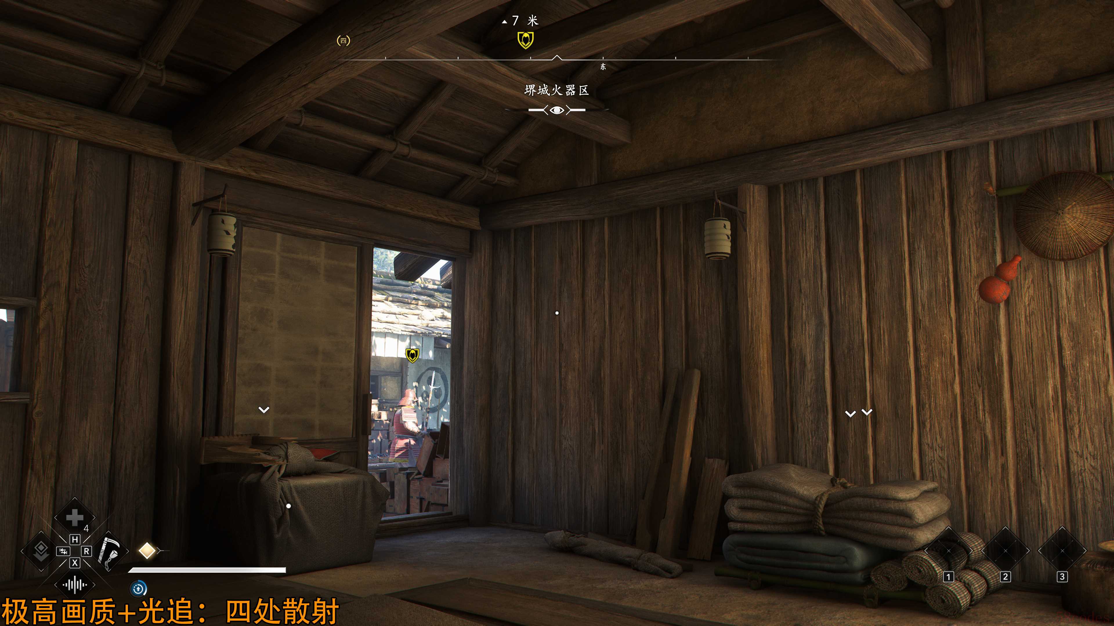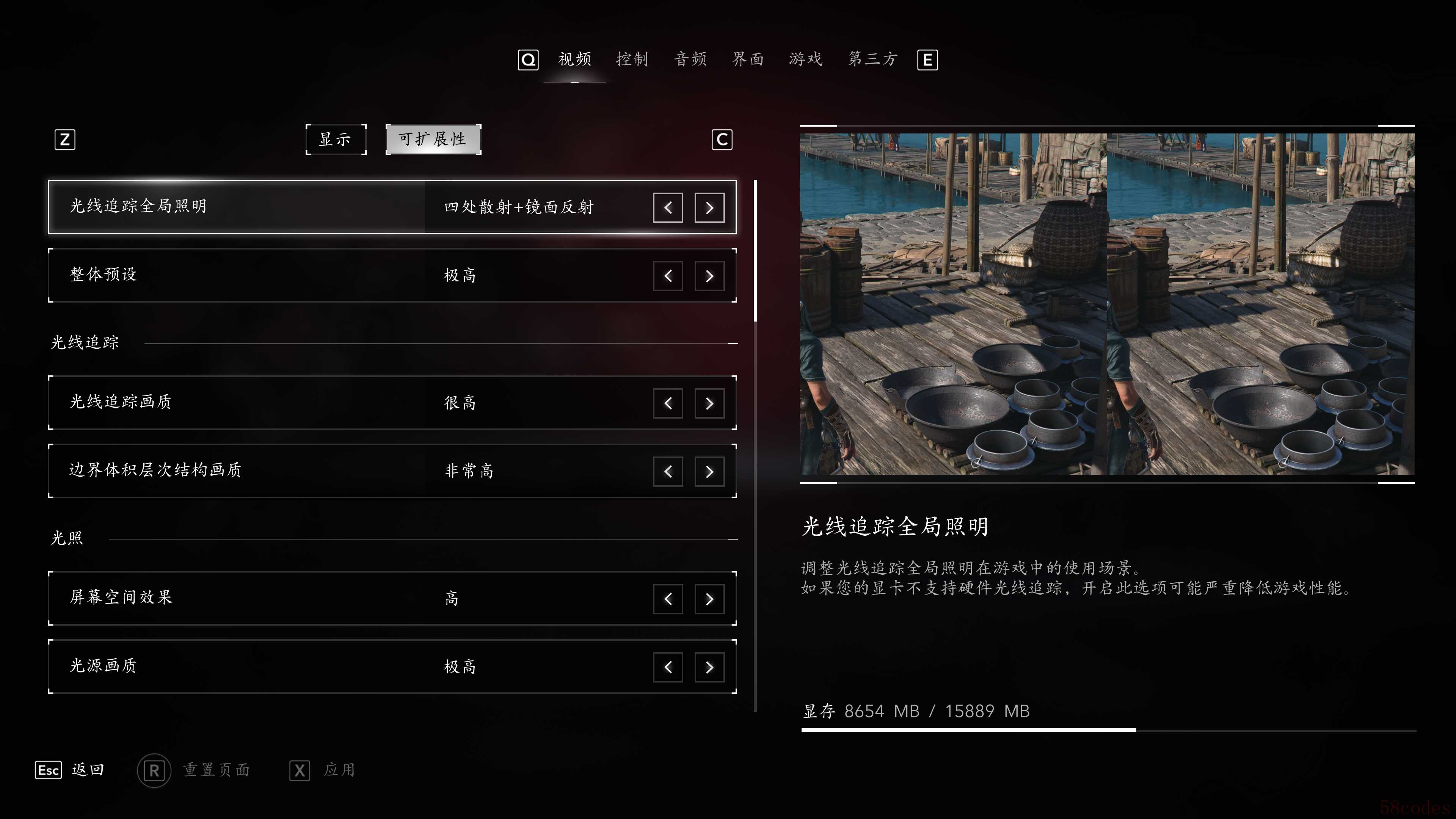 官方提供的预设分为低、中、高、很高和极高五档,具体选项数量虽不多,但是基本已涵盖开放世界所需的基本要素,尤其是加入了光线追踪全局照明(RTGI)和反射,结合游戏动态天气、昼夜循环以及暗杀过程中重要的照明量机制,两者的视觉效果差异相当大,各位可以在最后的画质对比环节看到。