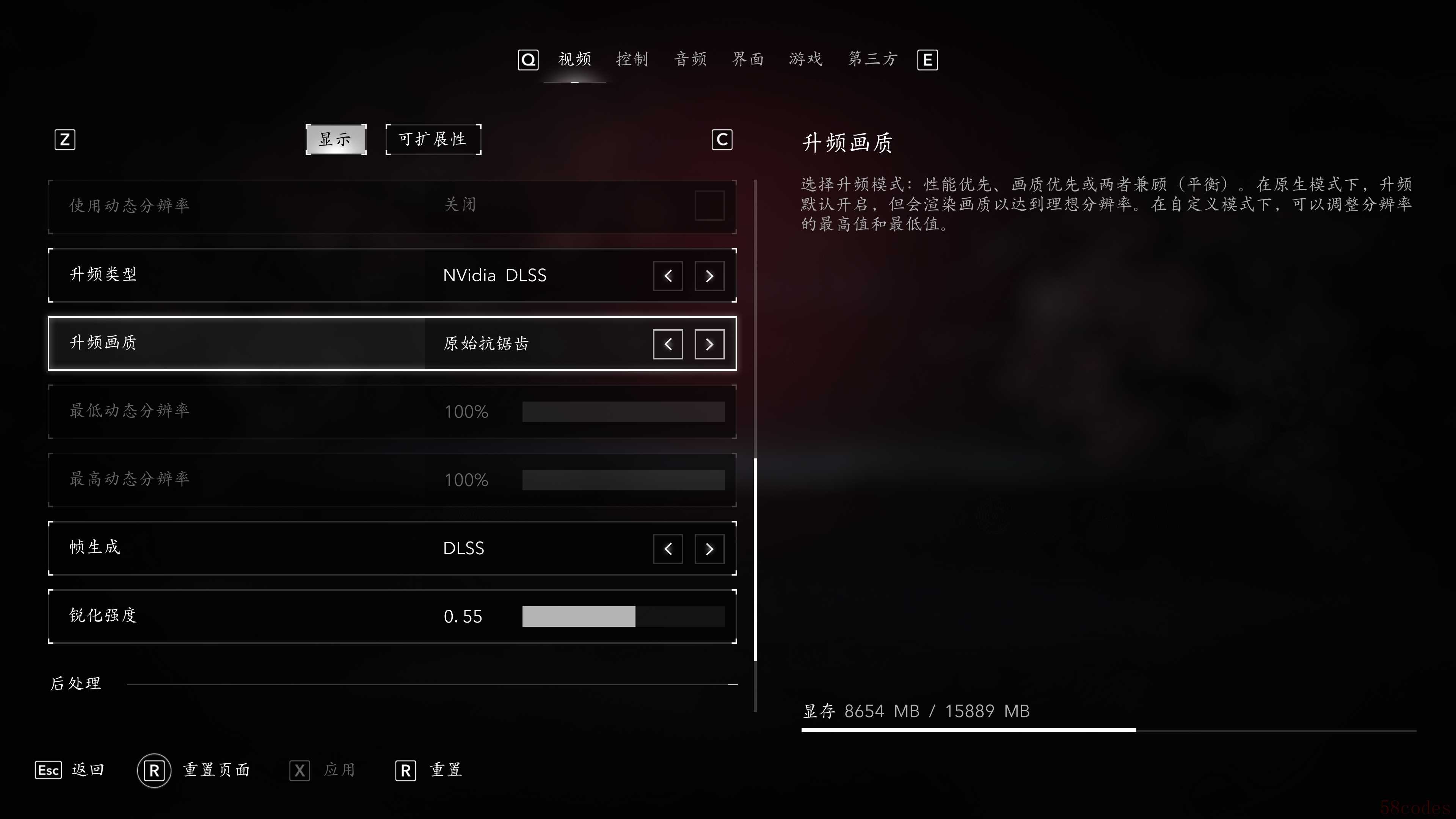 《刺客信条:影》UI界面设计逻辑相当不错,左边是画面选项,右边则是选项说明和显存占用,如果是涉及到影响画面的选项,还会即时展现当前设置的画面,以便玩家可以对比不同设置下画面差异。游戏支持NVIDIA DLSS 3.7、AMD FSR 3.1、Intel XeSS 2三种主流升频以及各家帧生成技术,就DLSS而言划分原生抗锯齿(DLAA)、画质、平衡和性能四档。