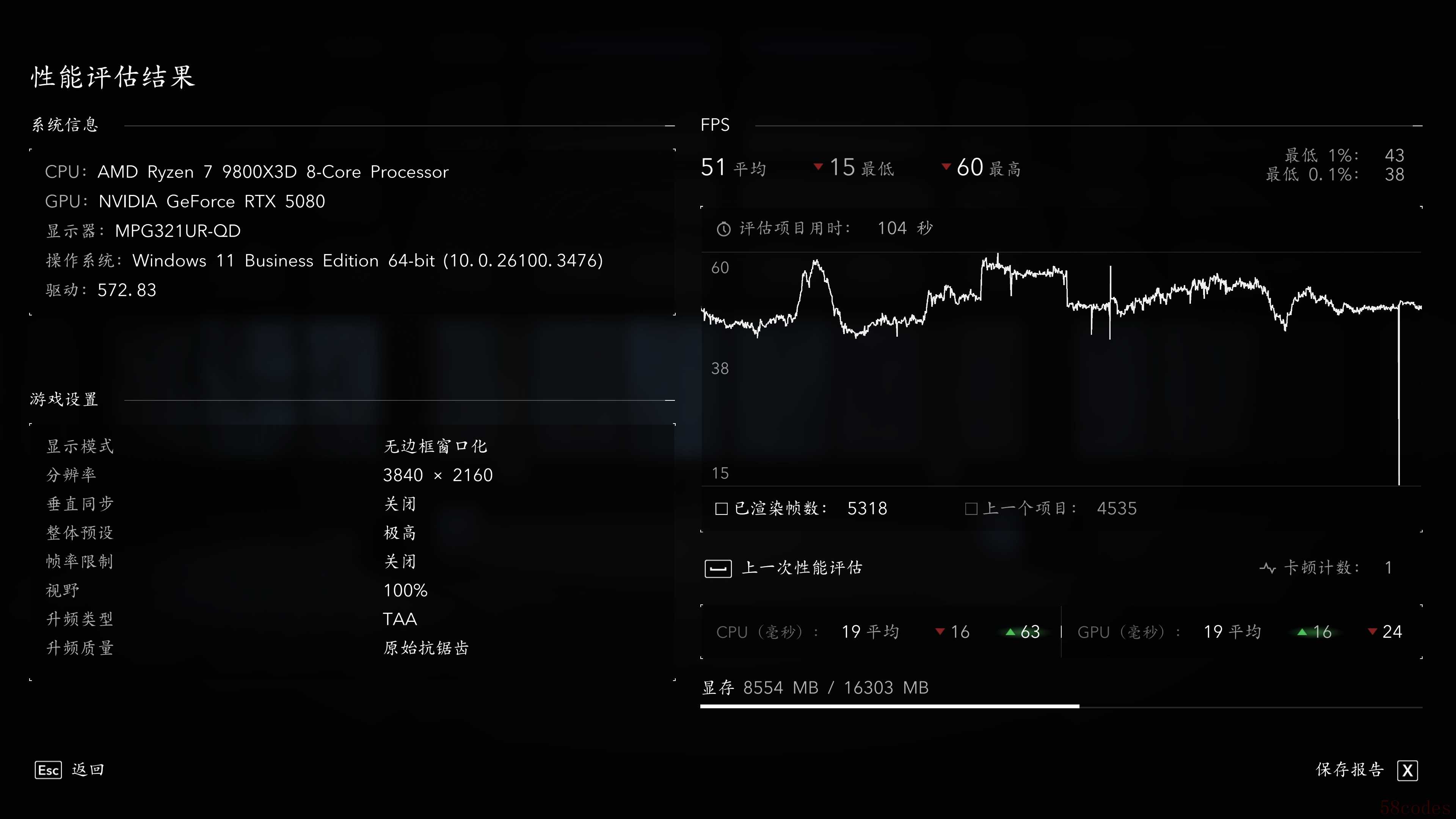 测试方法还是借助官方内置的性能评估程序,这个基准还是相当靠谱的,因为测试场景涉及到画面元素基本在实际游玩中都可碰到,除此之外,测试结果罗列的信息也相当详细,除了硬件信息、画面设置、平均帧、最低1%帧等数据,还特别记录卡顿次数。