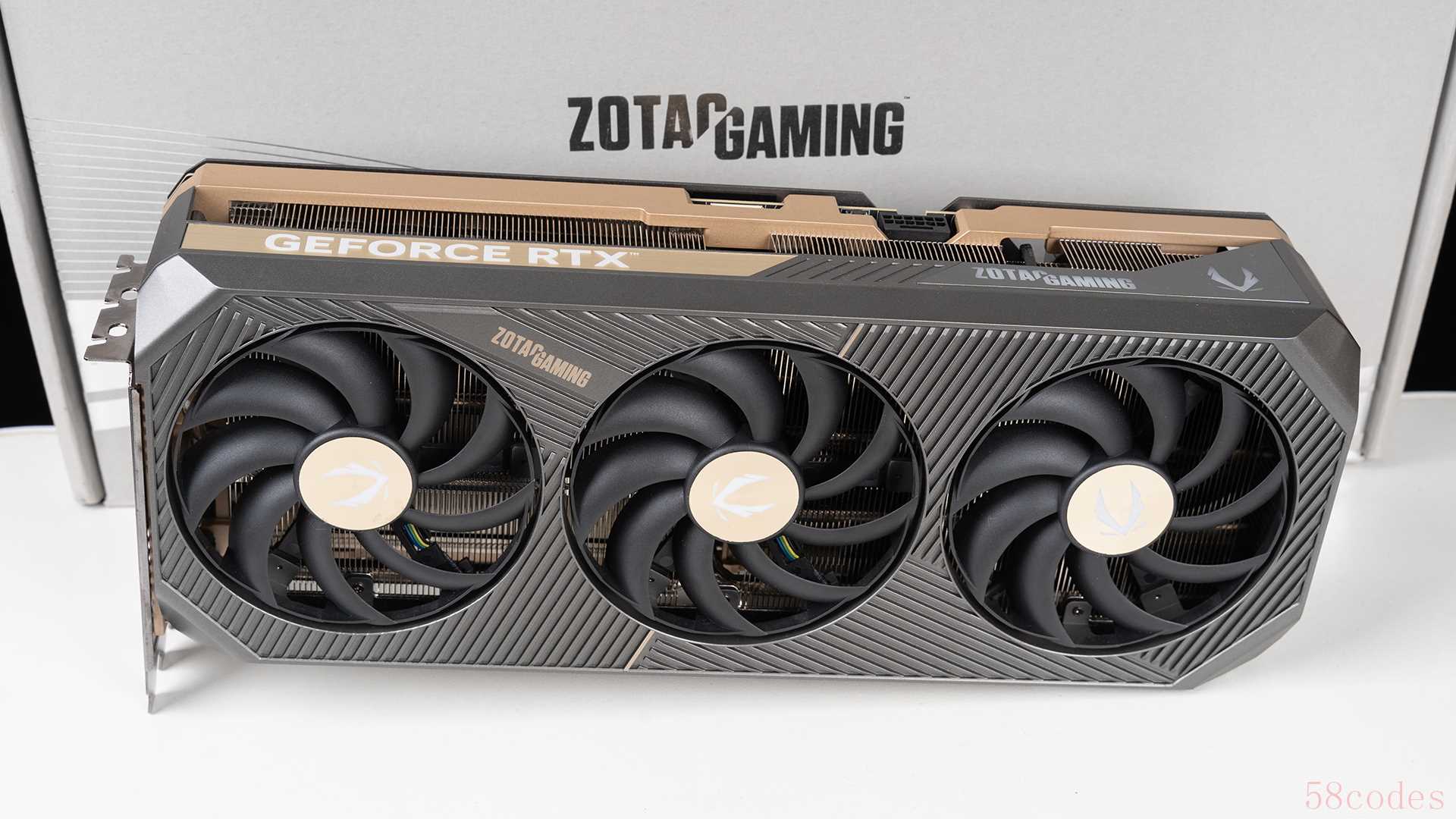 第一款显卡来自NVIDIA最新次旗舰——索泰RTX 5080 SOLID OC,外观采用大量斜向装饰的栅条,再搭配枪灰和古铜配色,它给予人一种极其硬朗又耐看的感觉,肩部拥有简约的ZOTAC GAMING灯效。