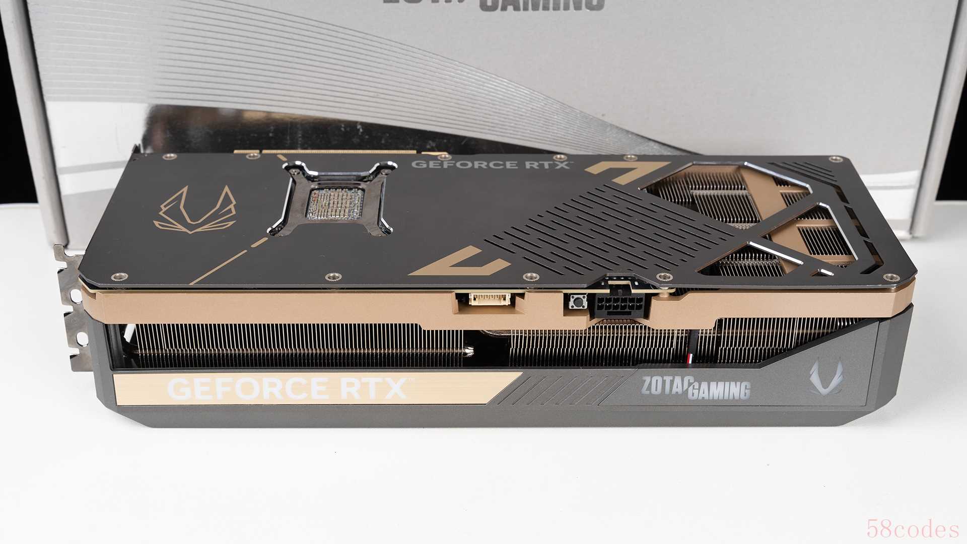索泰RTX 5070 Ti AMP EXTREME INFINITY的金属背板条纹会更加丰富,古铜色部分就是其合金中框,值得一提的是本代AMP系列在显卡尾部加入了无限镜ARGB的设计,构建出一种超现实的艺术感。显卡同样搭载12V-2x6 16pin供电接口,旁边还有双BIOS按钮和幻光同步接口。