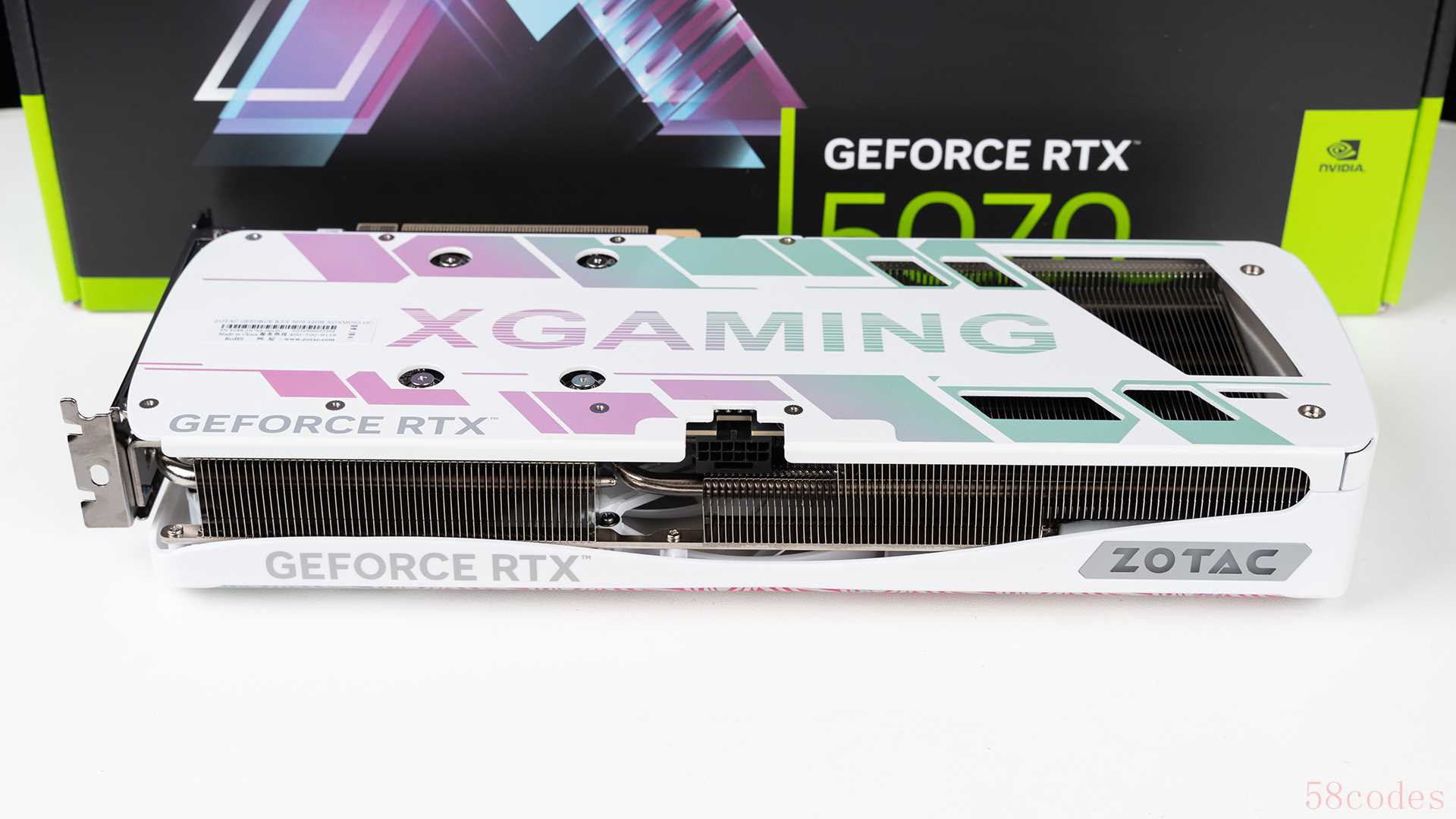 第三款显卡是定位中高端的索泰RTX 5070 X-GAMING OC,X-GAMING系列本代经过重新设计,外观更具时尚设计理念,导流罩采用鲜明活泼的色彩,表面还有斜向XGAMING LOGO和图腾纹理,并在不同角度时可变幻,更贴合年轻人的审美观。
