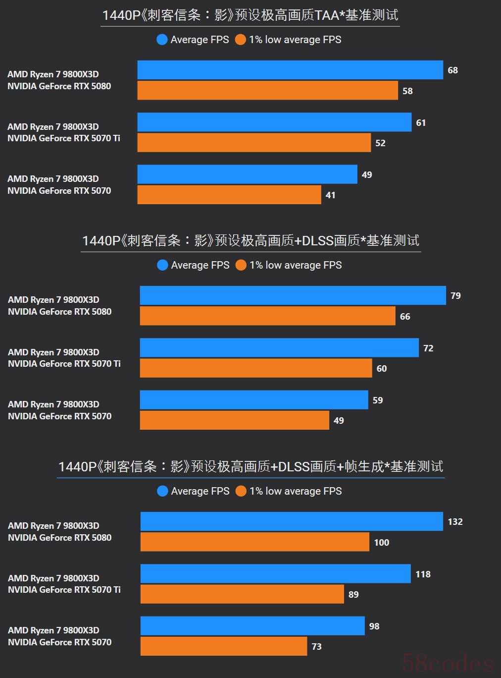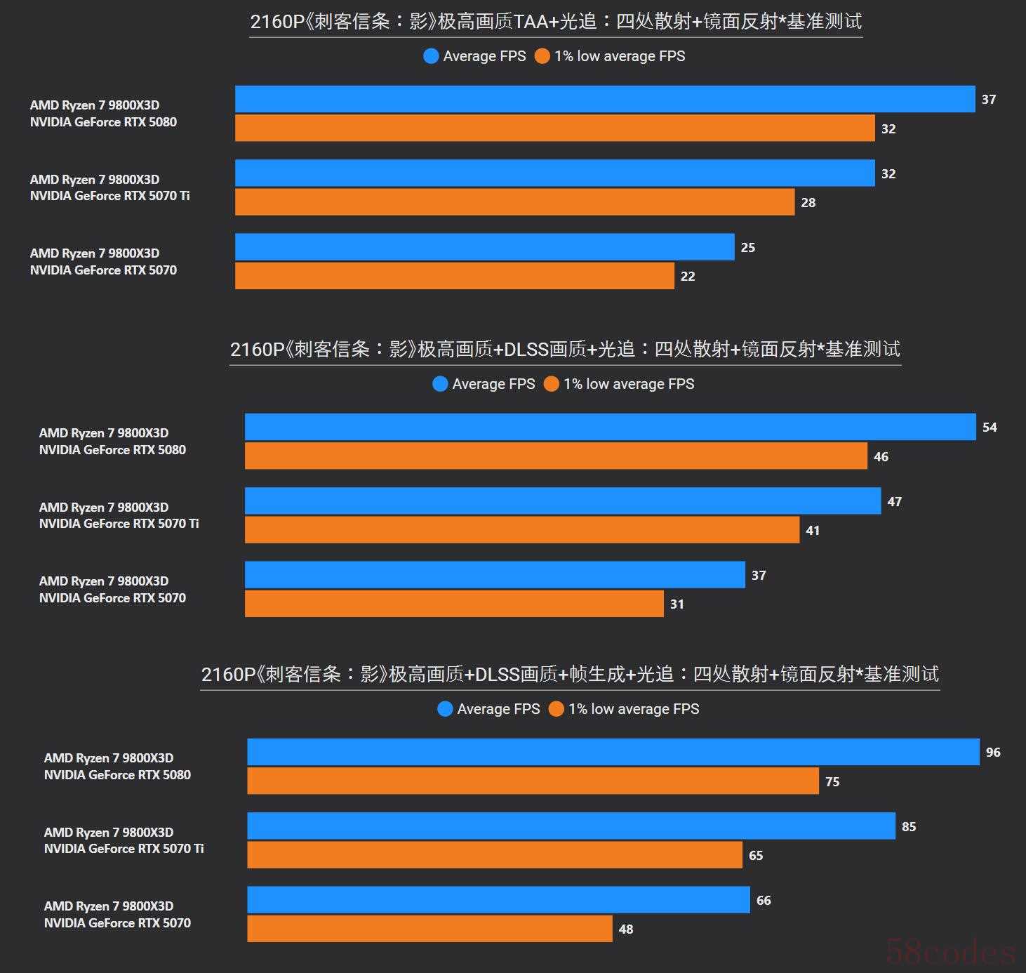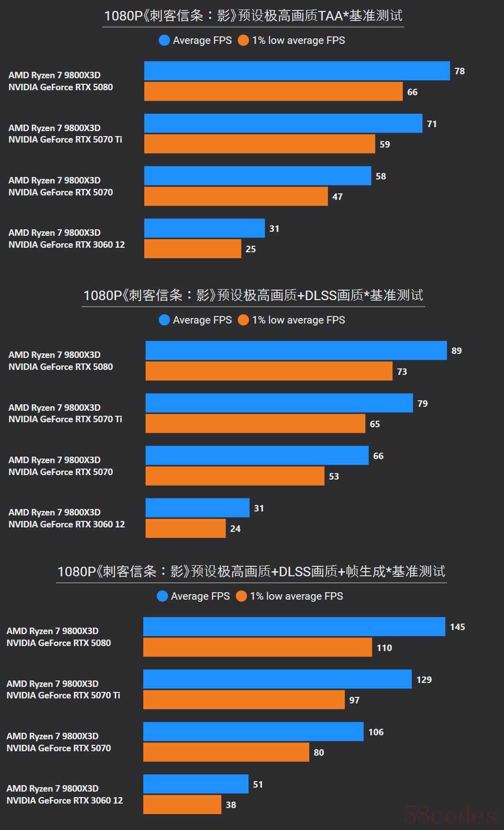 RTX 5080和RTX 5070 Ti在1080P分辨率差距在12%以内,两者都能在TAA原生情况大幅超过平均70fps,搭配帧生成技术后远超100fps。