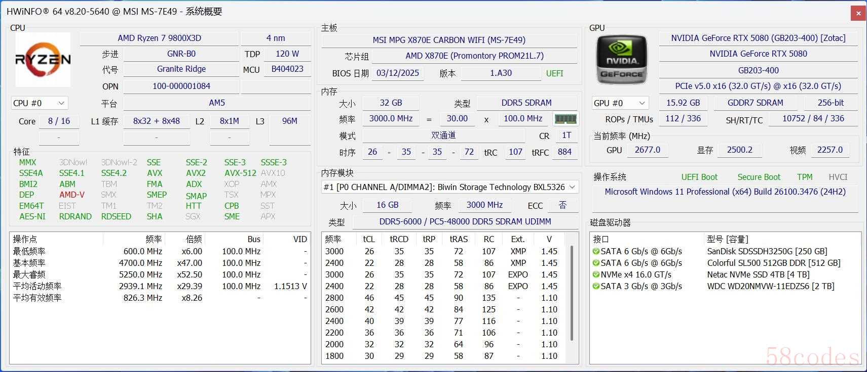 简单介绍一下本次测试的环境,锐龙7 9800X3D开启PBO技术便于发挥最大CPU性能,搭配内存是两根DDR5 6000C26 16GB*2(UCLK=MEMCLK同频)组成双通道,并在BIOS中开启Resizable BAR技术达到最大化显卡性能。