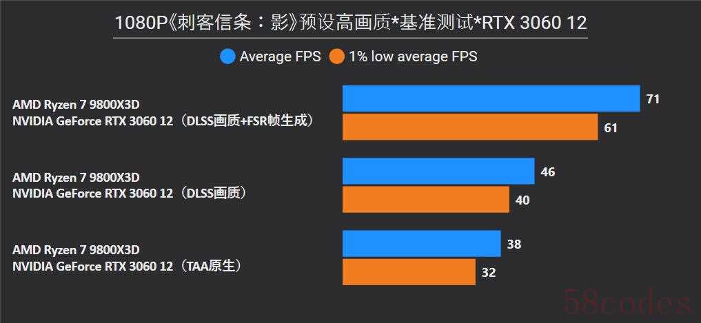 为了照顾老用户,这里对RTX 3060 12GB进行了加测,12GB显存确实不是瓶颈(1080P极高画质需要10GB显存),瓶颈的是核心性能,降到了高画质性能才能释放一些,个人建议是搭配DLSS画质游玩,这样1080P分辨率下能达到平均46fps,再补一手FSR帧生成就可完美来到71fps绝对流畅水平。