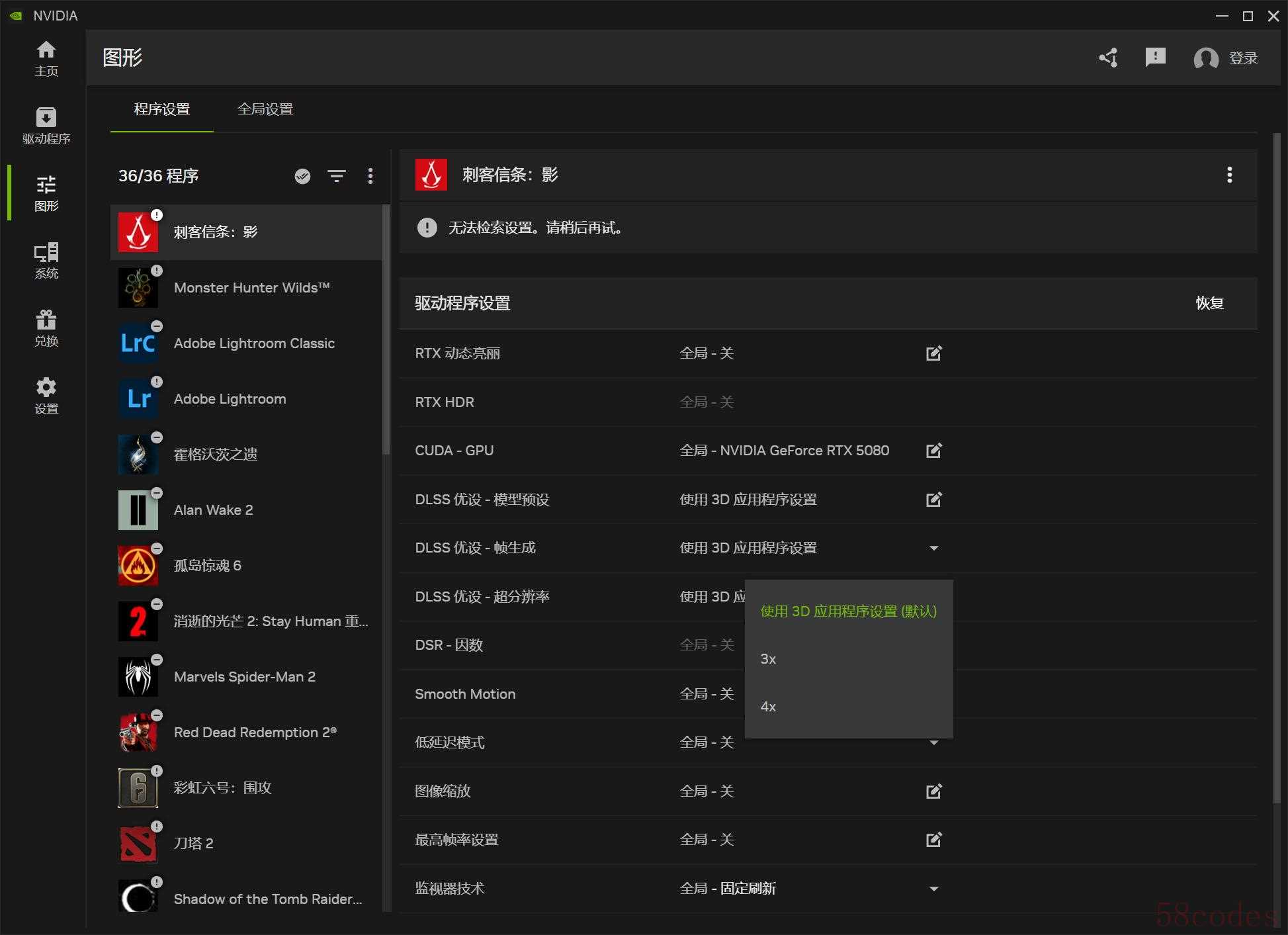 值得一提的是,只要安装了572.83最新版本驱动,就能在NVIDIA APP——图形——程序设置里面设置《刺客信条:影》支持DLSS 4,也就是3X和4X帧生成,个人使用下来在游戏里并没有遇到什么BUG,建议持有RTX 50系显卡玩家都可尝试一下。