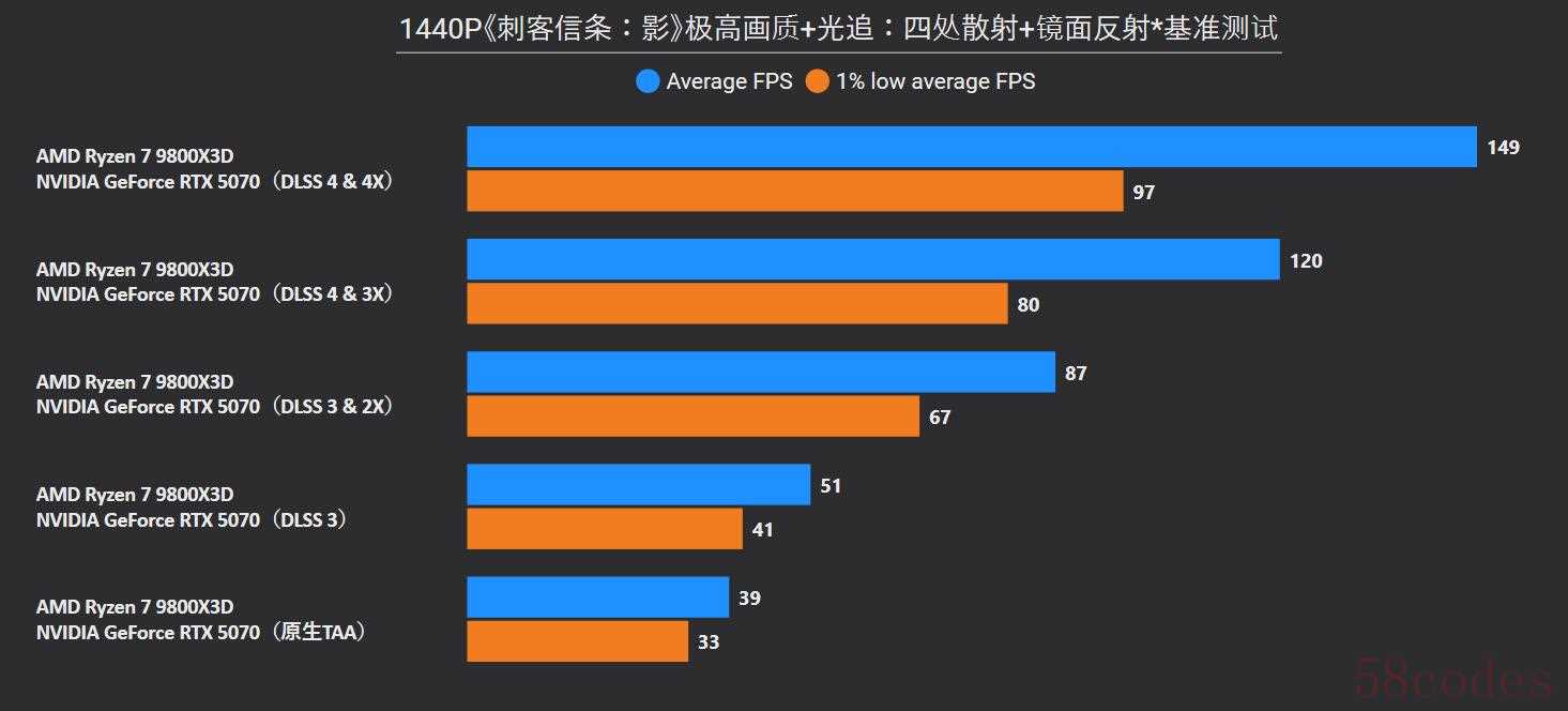 综合以上这些测试,鉴于《刺客信条:影》1% LOW帧和帧时间出色稳定表现,个人觉得开启帧生成、多帧生成的前置条件,甚至可以下探到原始帧45fps。