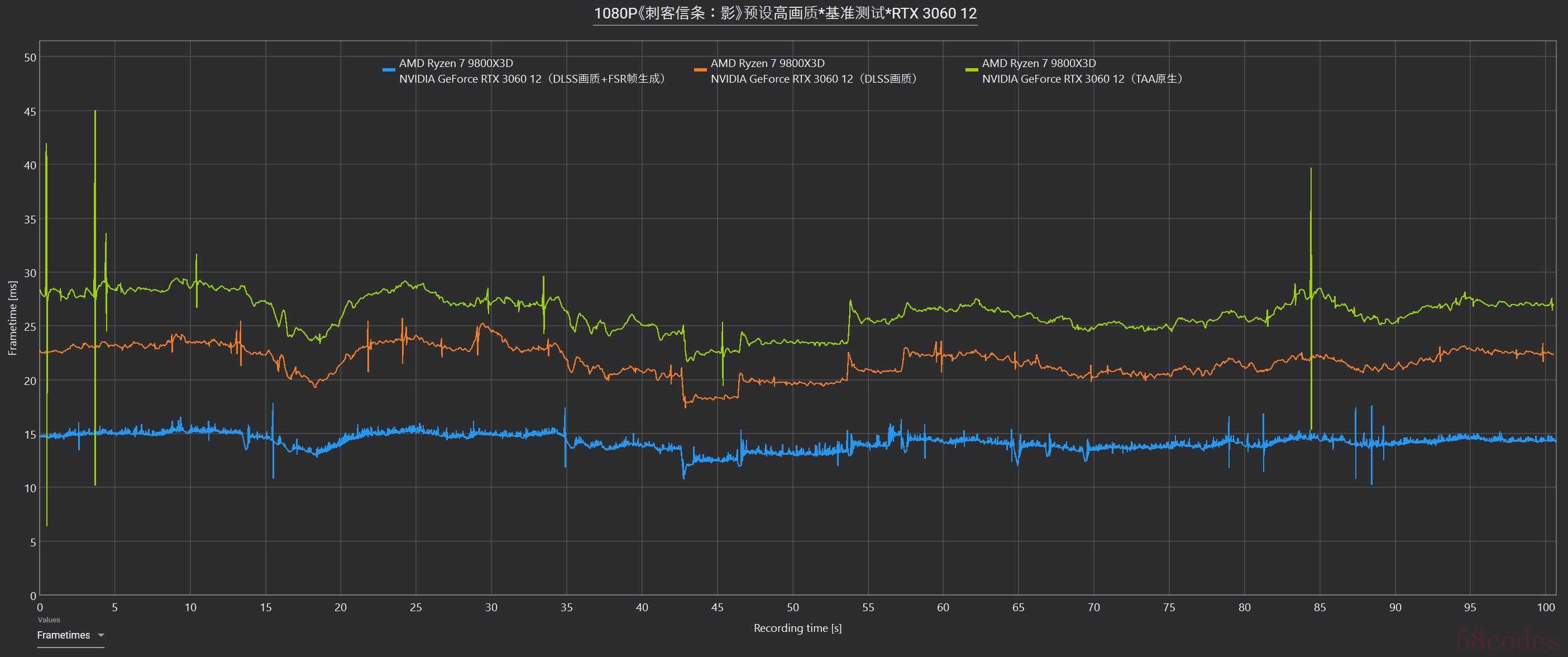 就以RTX 3060 12GB测试1080P高画质为例,原生TAA帧时间就是基本浮动在25~30ms之间(绿色曲线),104秒基准测试场景中,只有3处较为明显的波动,而搭配DLSS画质+FSR帧生成(蓝色曲线),帧时间下降到15ms左右且没有明显波动,是极其贴合原生帧数的标准值,至于其他三款RTX 50显卡就更不用多说了吧。