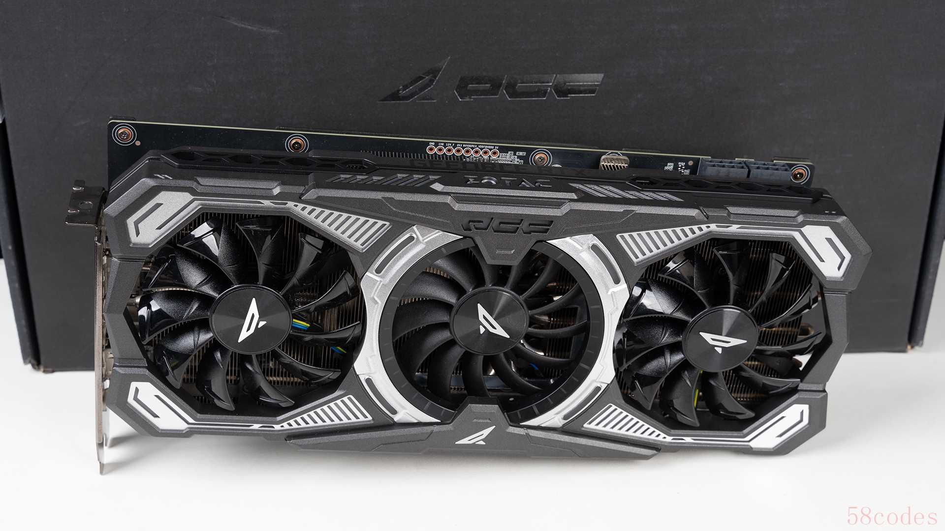 为了给一些老N卡用户参考,硬核这里还特意准备了一款老卡供大家作为性能参考,来自索泰的RTX 3060 12GB PGF XOC, 外观上采用了PGF经典硬朗造型——复杂多变线条营造出来的肌肉感,作为一款只有240W功耗的显卡,用料也是狠狠堆满三风扇+夸张的8热管配置。