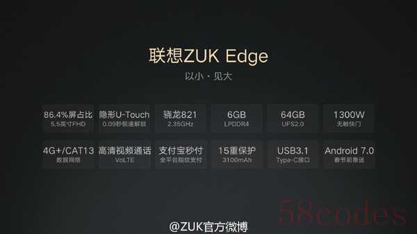 ZUK Edge不久后还将能升级到基于Android 7.0的ZUI 2.5操作系统,支持分屏、录屏、锁屏设置成全屏壁纸、流量智能管理、独创的发热先知技术、定制化的音频外放模组、全自动的智能的垃圾清理等特点。