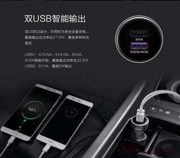 昨天,华为的SuperCharge车载快速充电器正式在官方商城上架开卖,售价为199元。按照华为的说法,这款车载充电器支持快充,最高电流可达5A,理论单个设备最大功率可达22.5W。除了4.5V/5A之外,还兼容9V/2A和5V/2A充电模式。该充电器支持为Mate 9、Mate 9 Pro等机型快速充电,半小时可充入58%的电量。华为车充提供了两个USB接口,可同时为多台设备充电,最高输出总功率可达27.5W。其中一个USB接口被涂成紫色,最高支持22.W快充,另一个普通接口仅支持5V/1A充电。此外,华为车充还标配了华为原装5A数据线,这是非常厚道的。选购它的前提是咱得先买量车哦。