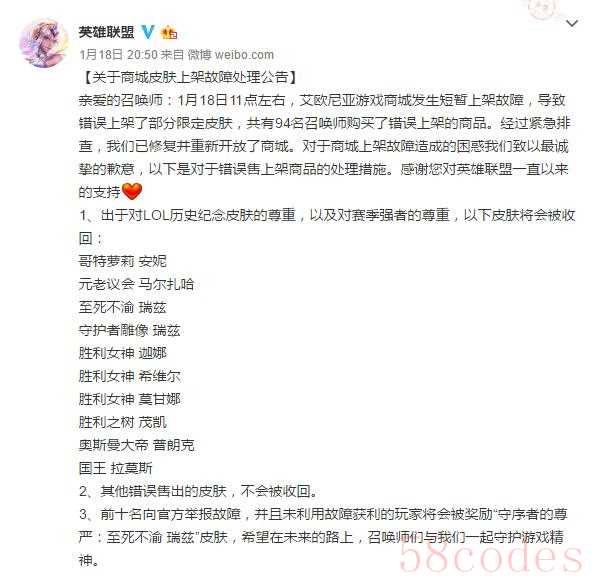 18日上午11时10分左右,《英雄联盟》商城又出现了一次重大的Bug,有玩家发现很多绝版皮肤竟然正在出售,包括瑞兹的“至死不渝”、安妮的“哥特萝莉”和盲僧的“龙的传人”等,但整个过程只持续了几分钟,抓住机会的玩家们也是大呼过瘾,而腾讯随后便宣布紧急关停商城。上一次《英雄联盟》出现类似的“福利”Bug是原本售价6900点券(或者9450金币)的符文页变成了50金币一页,但腾讯在修复商城后并没有追究在此期间购买符文页的玩家。