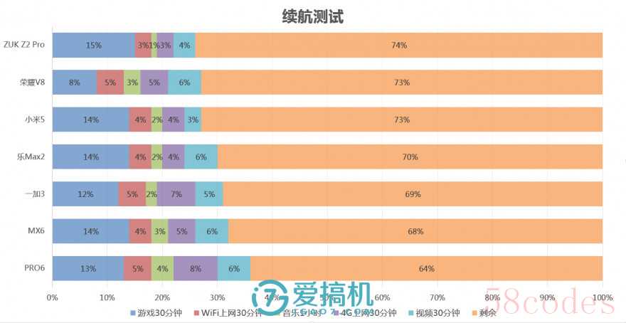 ZUK Z2 Pro搭载3100mAh电池,经过了30分钟大型游戏(NBA 2K15),各30分钟的wifi和4G上网,1小时音乐播放和30分钟本地视频播放,整整3个小时的续航测试后,剩余电量74%。8小时连网关4G开wifi待机,掉电2%