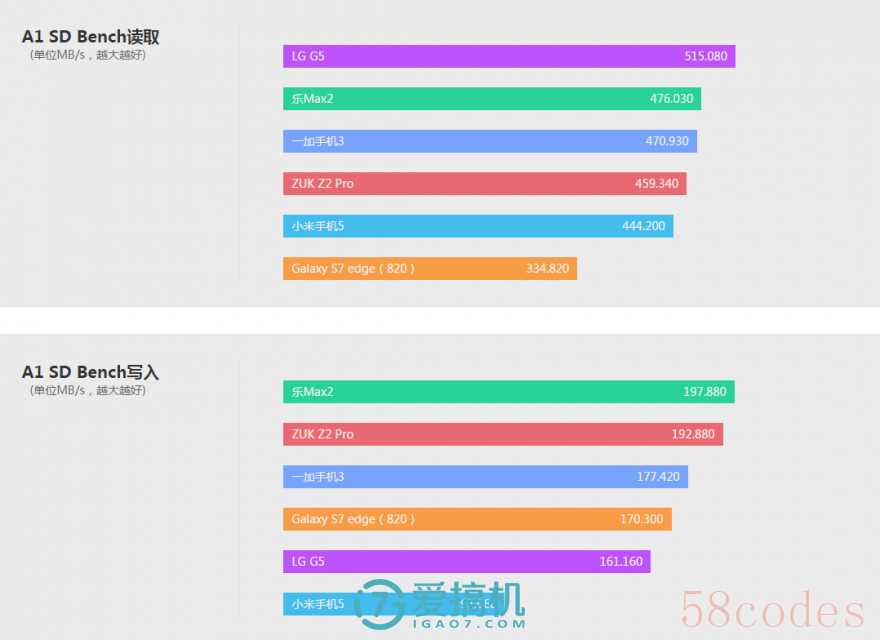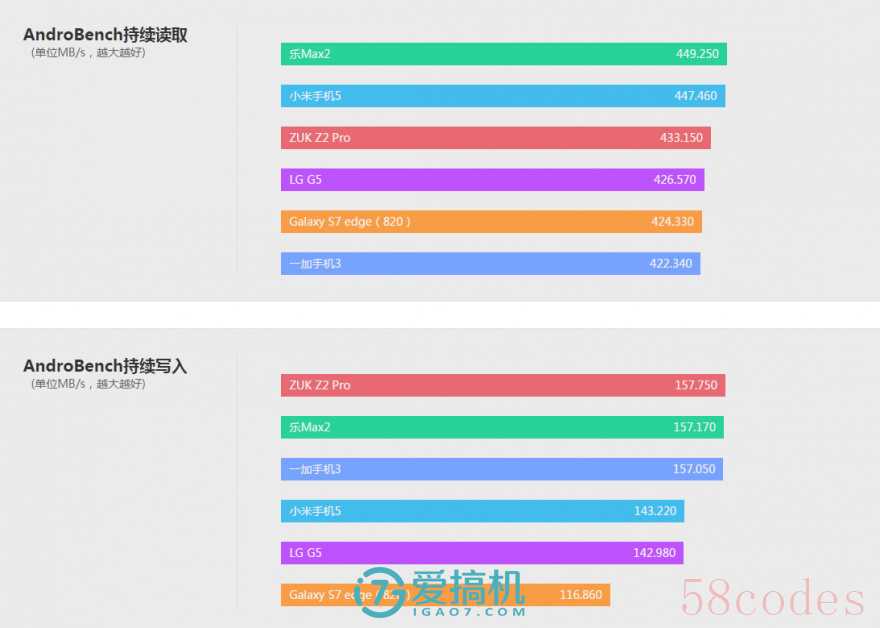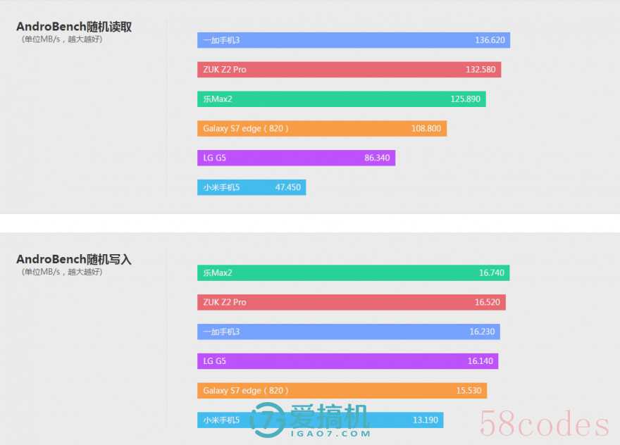 闪存读取速度方面,这和应用打开速度有直接联系,一般闪存容量越大,读写速度越快。一加3和乐Max2测试机都是64G,其他都是32G,128G存储的ZUK Z2 Pro本应是最快的,但实际成绩中它也只是最快的几部之一,未能和两部64G存储的机器拉开差距。