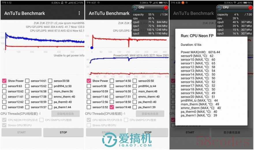 使用拷机应用进行CPU拷机测试,证实了ZUK Z2 Pro性能表现低下的主要原因,是核心频率调控过于消极: