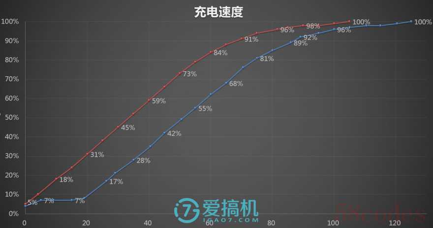 实际充电速度上,除去原装充电头开头15分钟“充不进”(也可能是电量虚标)的bug,原装充电器和快充头在充电速度上的分别不大。快充头充电,从5%-90%充电耗时70分钟左右,30分钟充到45%左右,充饱共耗时1小时45分,表现比较让人失望。