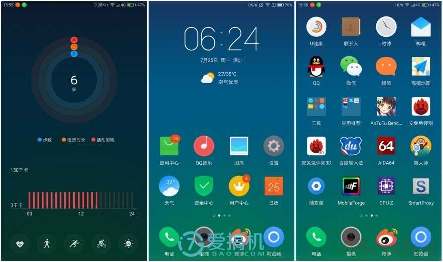 ZUK Z2 Pro非常重视健康检测功能,桌面最左侧是计步统计页面,里面有测心率和紫外(UV)的功能入口。提供了底部上拉控制栏,集成了可自定义排序和隐藏的快捷开关,所以通知栏看起来很空旷。