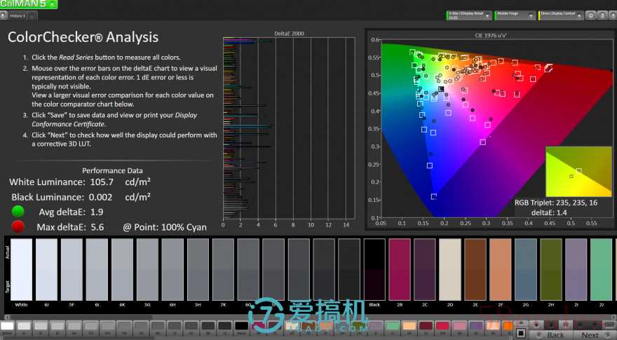 104色平均deltaE1.9,最大deltaE为5.6,主要是蓝色相关的颜色的色差较大,但整体表现惊艳。作为对比,Note5是1.8,S6 edge+是2.6,S7 edge是2.9。这不单是我们现在遇到过色准表现最好的AMOLED屏幕,即便放在所有的屏幕里面,这色准表现也相当优秀,值得点赞。