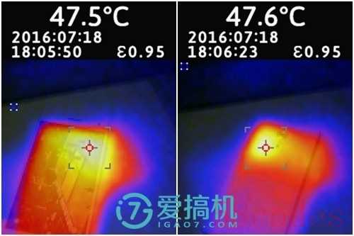 ZUK Z2 Pro虽然有明显的降频,但是发热控制却不太理想:25分钟NBA 2K15之后,正面最高温出现屏幕右上角,为47.5度,背面最高温出现在摄像头左侧,为47.6度,表现堪忧,所幸的是机器非游戏场景的发热正常。