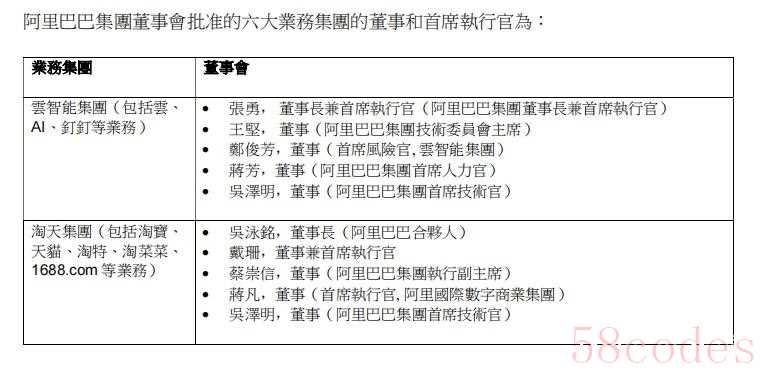 3月28日,阿里巴巴集团董事会主席兼首席执行官张勇发布全员信,宣布启动1+6+N组织变革,成立云智能集团、淘天集团、本地生活集团、阿里国际数字商业集团、菜鸟集团、大文娱集团等六大业务集团和多个业务公司。各业务集团和业务公司将分别设立董事会,实行董事会领导下的CEO负责制,阿里巴巴集团则将全面走向控股公司的管理模式。