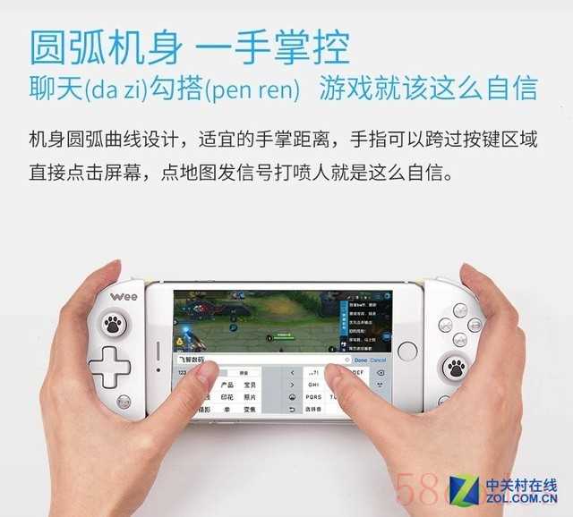 飞智wee拉伸手柄外观上最大的特点就是采用了横向拉伸的结构,机身整体采用圆弧曲线设计,手指可以跨过按键区直接点击屏幕,不需要离开手柄就能打字操作。