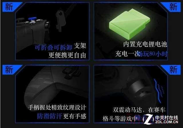 飞智黑武士X8Pro具有可折叠可拆卸的手机支架,玩游戏时看手机更方便。手柄内置充电锂电池,充电一次可以畅玩80小时。手柄握持出采用精致的纹理设计,在防滑防汗的同时还可以保证有优秀的手感。内置双震动马达,在赛车类和格斗类游戏中体验更加的真实。