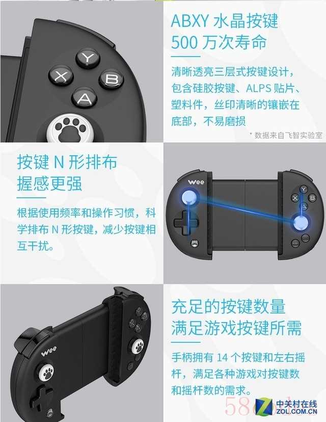 飞智wee拉伸手柄采用三层拉伸结构,使得拉伸时可以容纳75-165mm以内的手机尺寸,在收缩时可以占用更小的空间。采用日本进口ALPS摇杆,拥有100万次旋转寿命,精度可达0.117度。