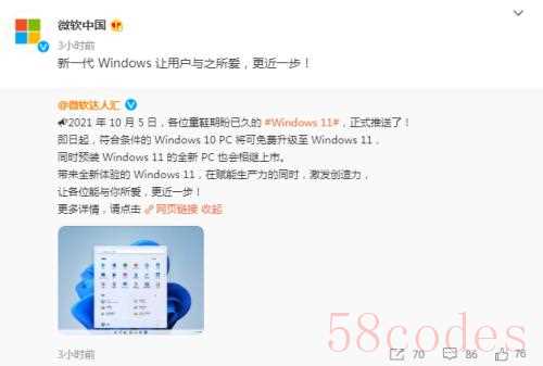 10月5日,微软中国在微博上宣布,这一天起Win11正式推送了,即日起,符合条件的Windows10 PC将可免费升级至Windows11,同时预装Windows 11的全新PC也会相继上市。
