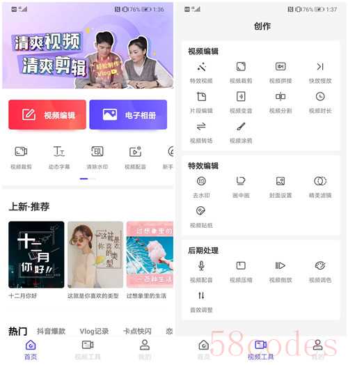 它支持视频压缩和制作电子相册,视频压缩可以压缩视频的大小,比如将一个100M的视频,很轻松的压缩到30M,这样就节省了70M的空间。制作电子相册呢,则是将数十张照片合并成一个相册视频,也在一定程度上释放了空间,可谓非常实用。