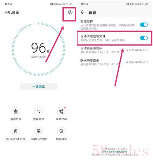 设置步骤:手机管家——设置——自动清理垃圾文件