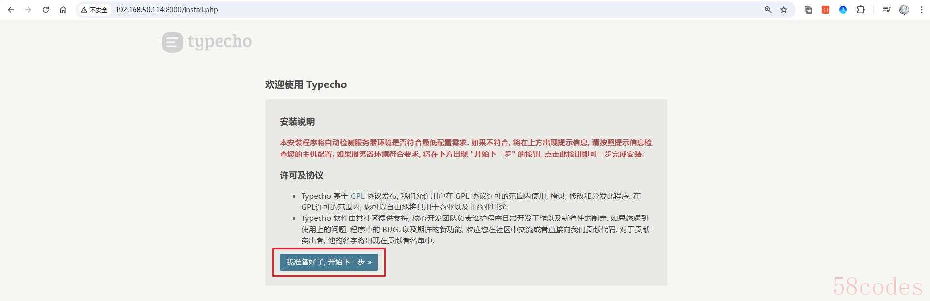 接着回到Typecho配置页面,点击页面的我准备好了,开始下一步按钮: