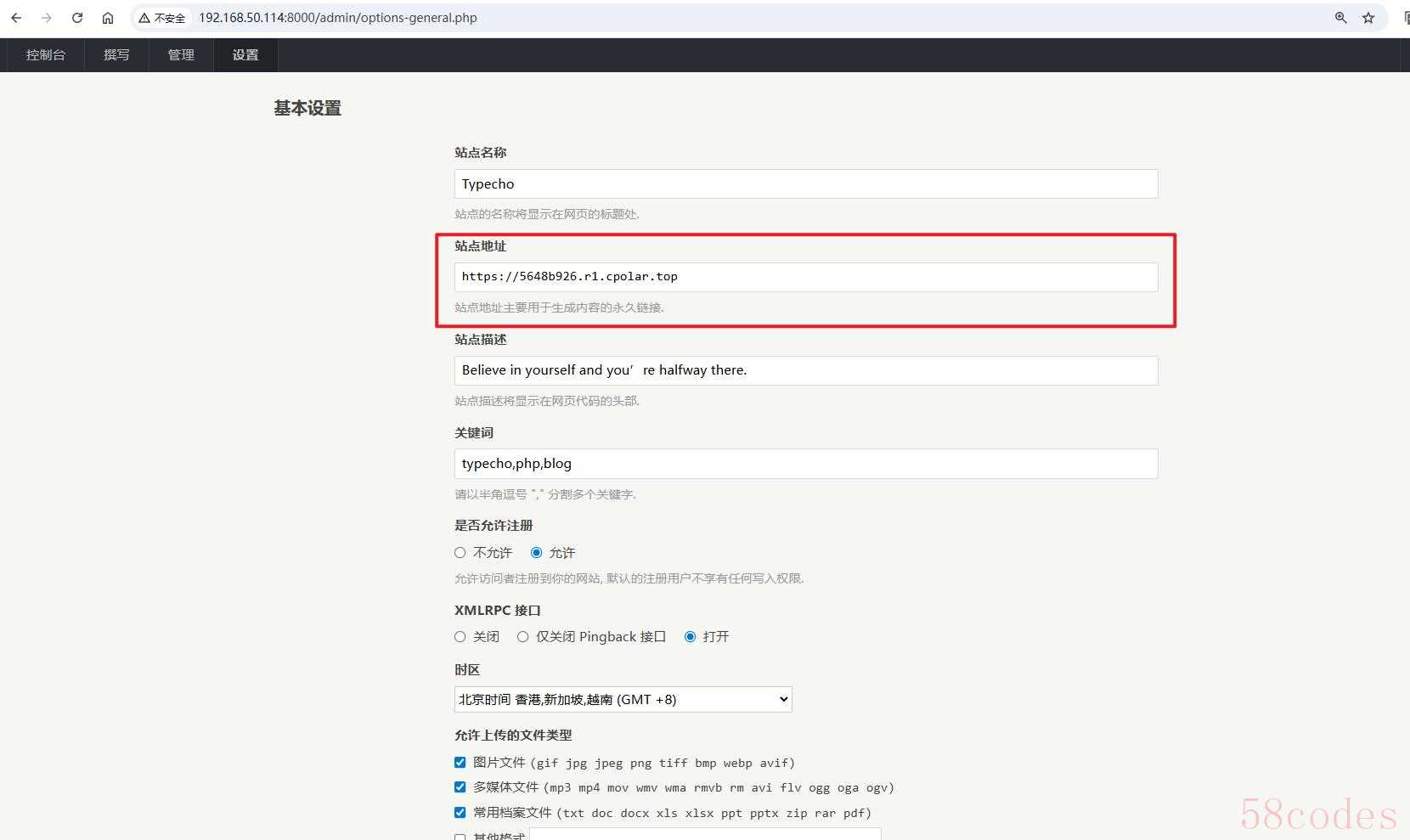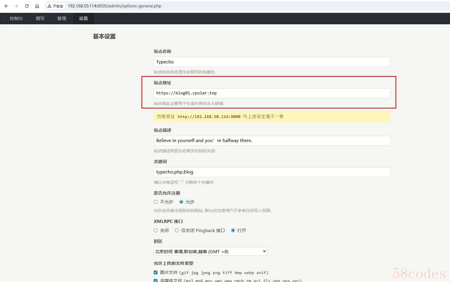 回到Typecho博客的设置页面,修改站点地址为固定的域名: