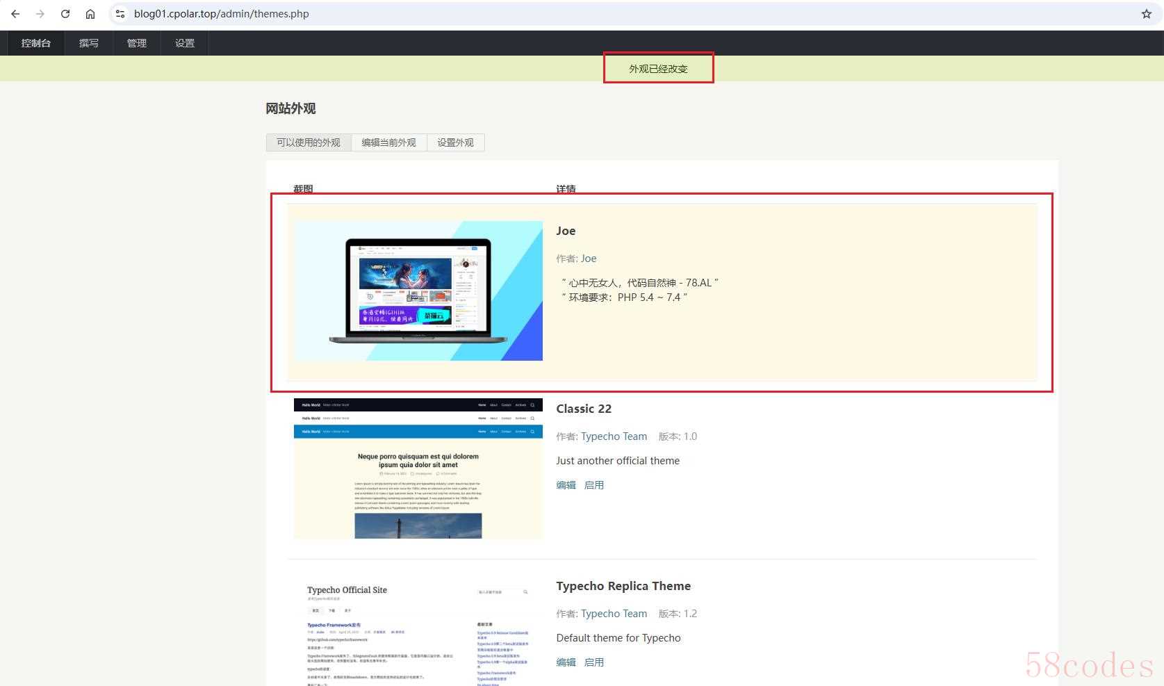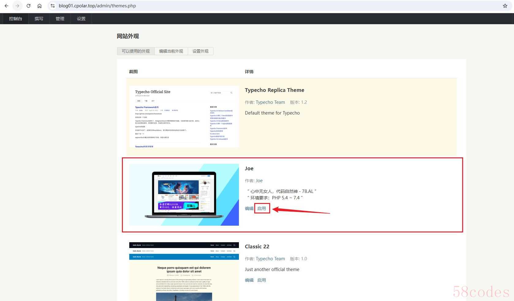 然后在网站外观页面,可以看到可以使用的外观里面,多了一个Joe主题,点击启用按钮即可启用该主题: