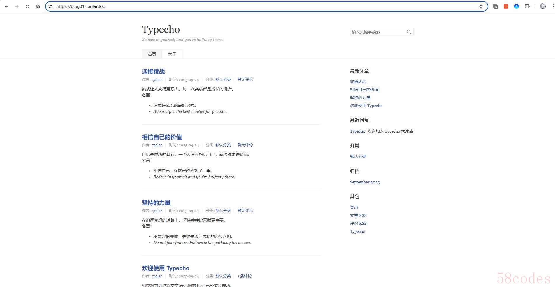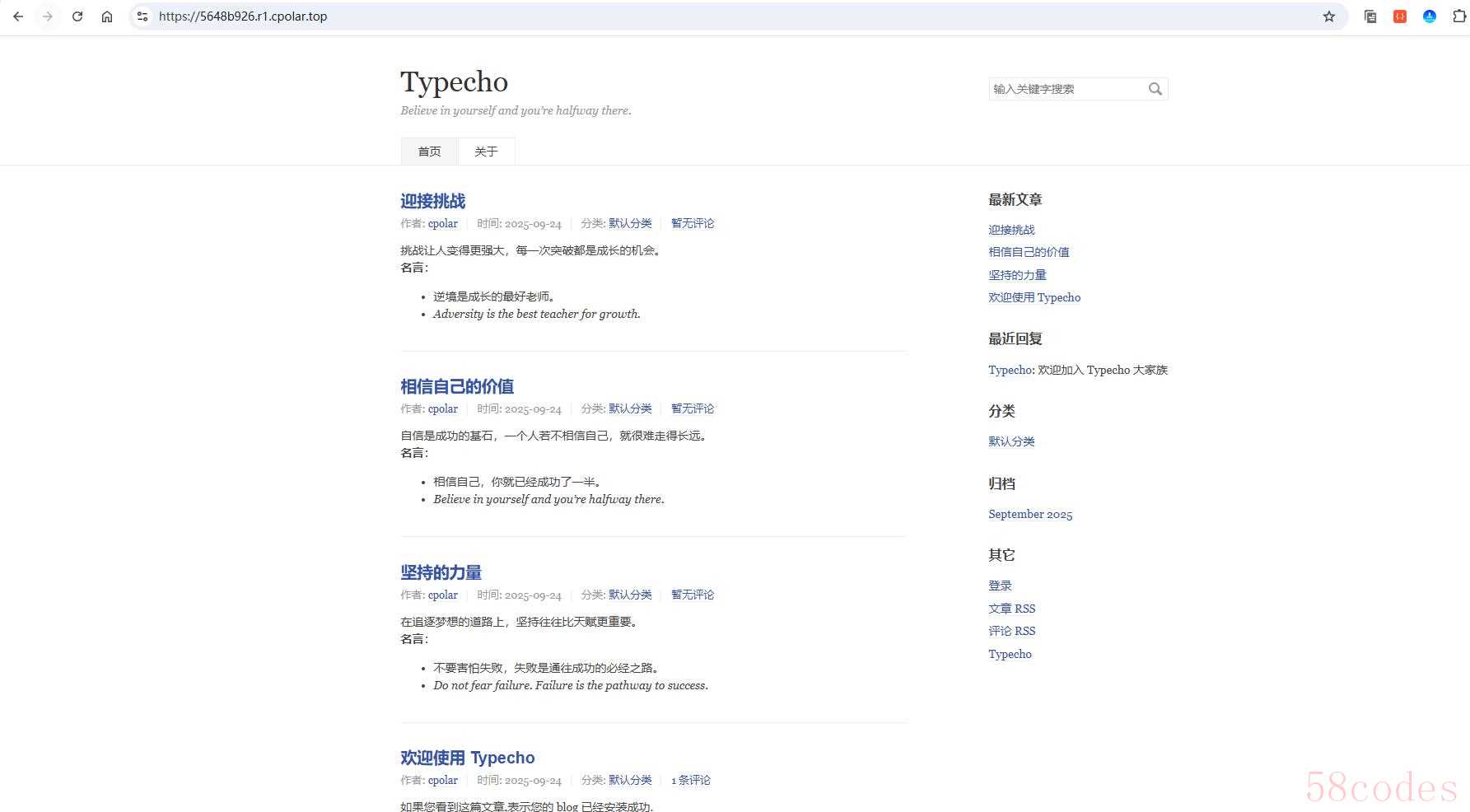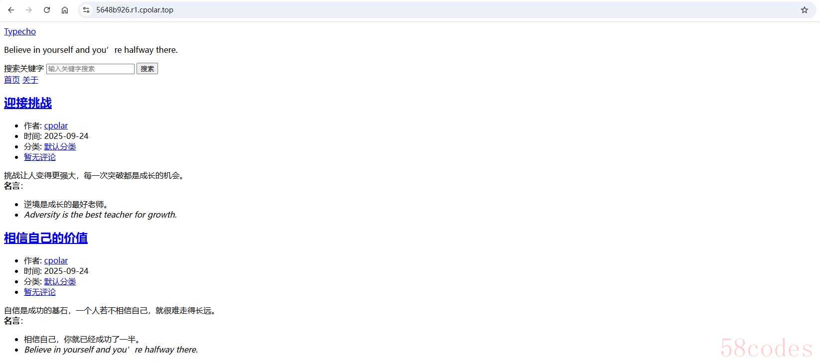 至此,公网访问已打通。需要说明的是,随机域名方式更适合预算有限的场景:系统大约每24 小时会自动更换一次地址,不太适合长期访问或对外分享;并且当地址变化时,你还需同步更新 Typecho 后台的站点地址,否则样式与资源可能加载异常。若希望长期稳定、免改配置地对外访问,建议使用固定域名方案。