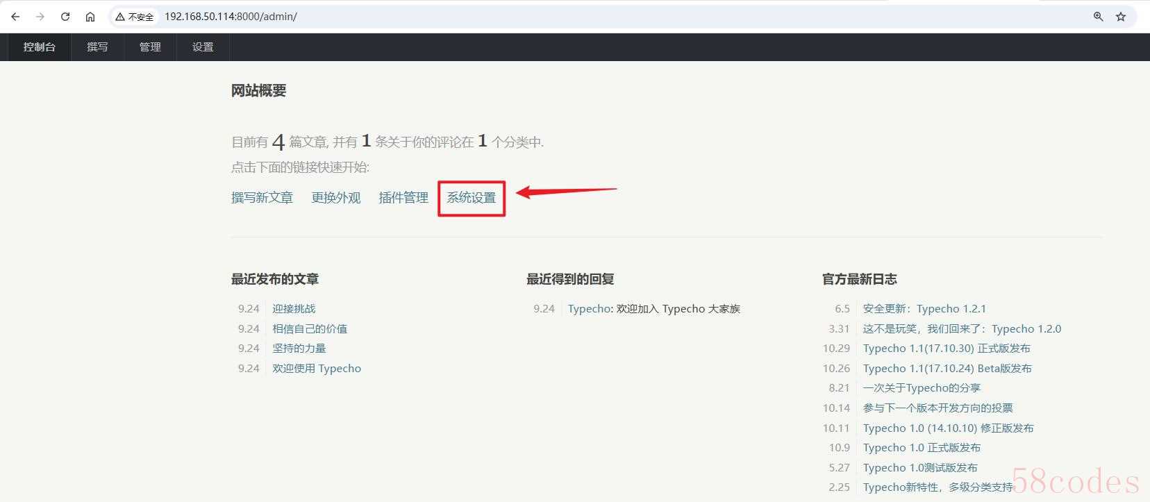 首先,访问Typecho博客的后台页面,点击页面上的系统设置按钮: